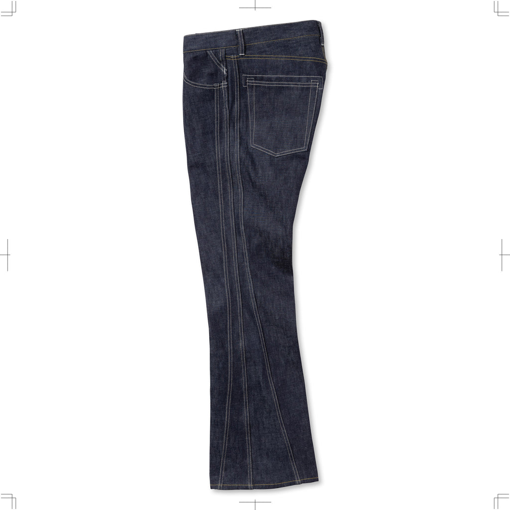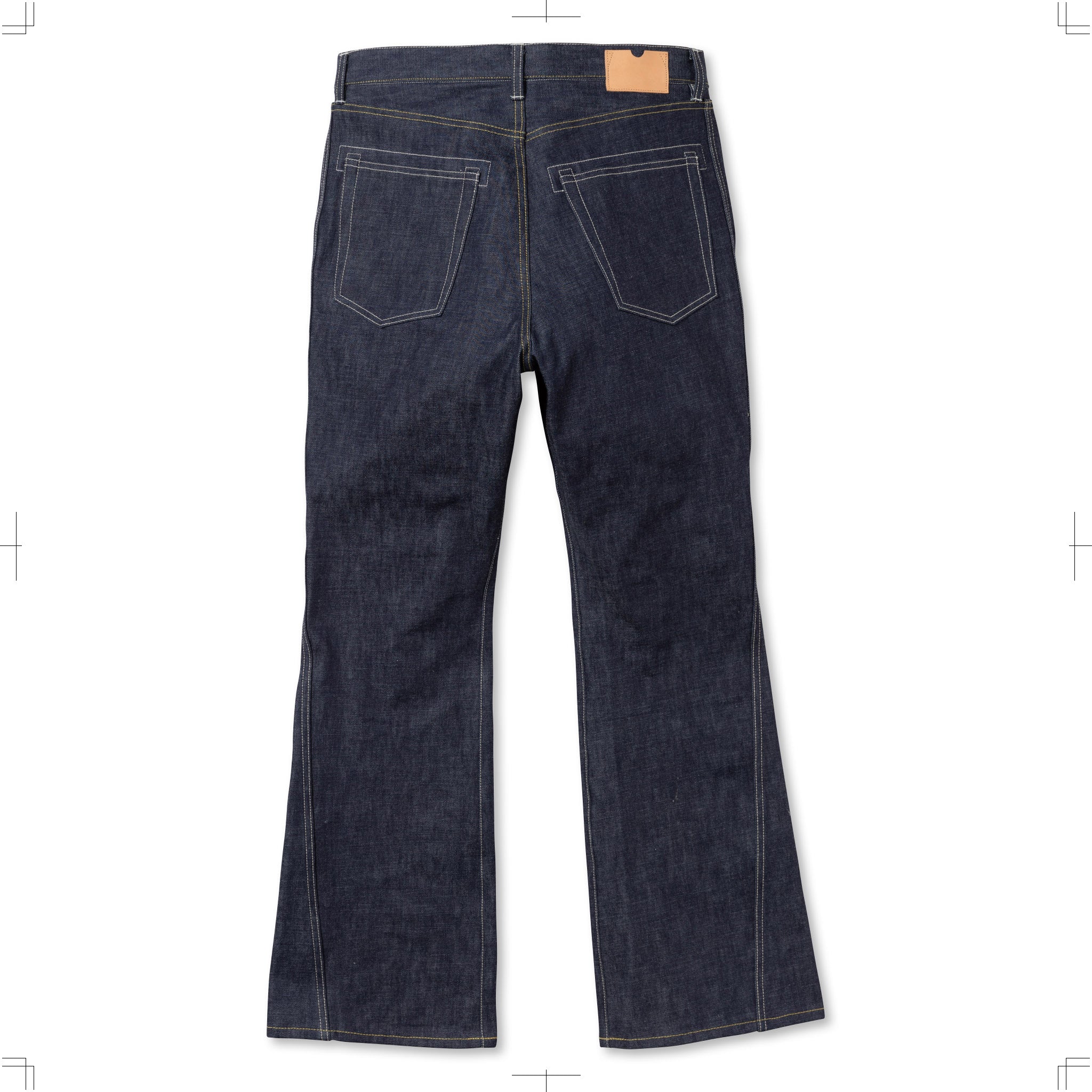 Flare-silhouette 6-pocket denim featuring three side seams. Made from 13oz rigid denim, it includes a coin pocket on the right front, a keyring loop on the left front, and a small pocket on the waistband patch. The back pockets are reinforced with tape, concentrating multifunctional details into a single pair of denim. As it is rigid, shrinkage may occur after washing.