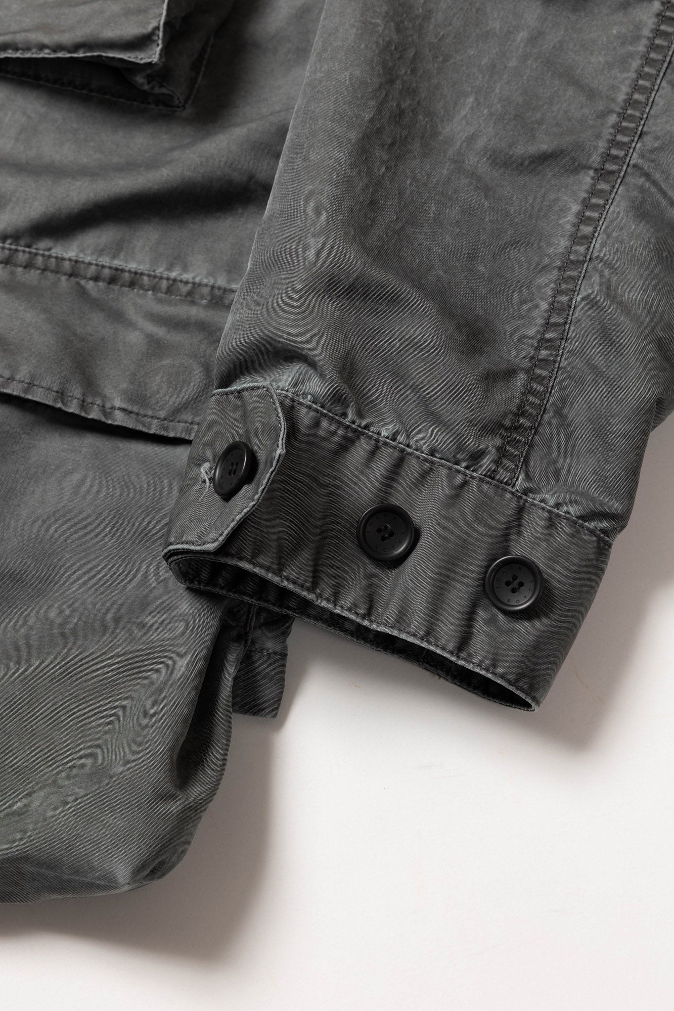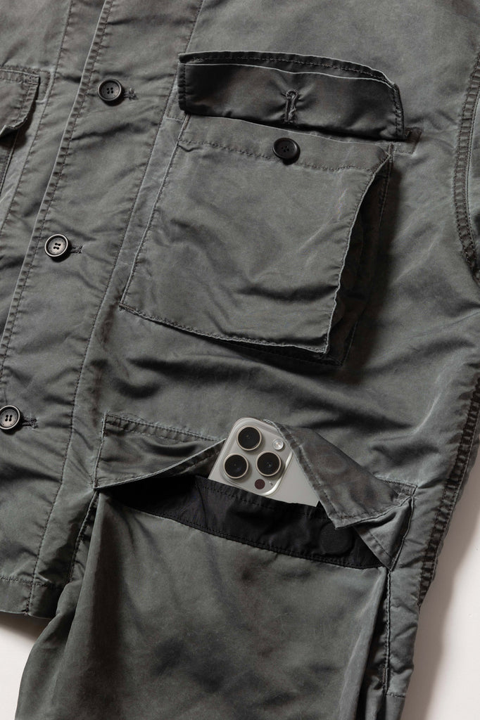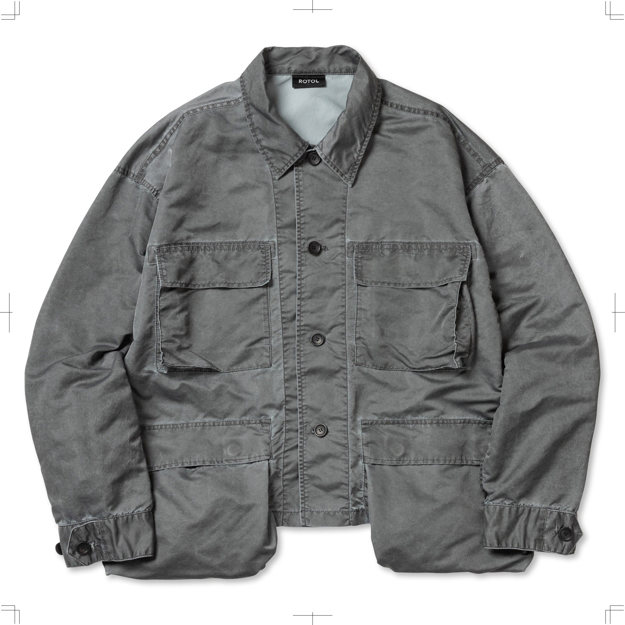 A shirt jacket based on the fatigue jacket design. Made from nylon oxford fabric with a pigment print, the product finishing creates a stone-like texture and puckering effect. The waist pockets include two types: hand-warmer pockets and magnet-button pockets, allowing for versatile use depending on the situation. Due to the product finishing, there may be variations in damage and individual differences.