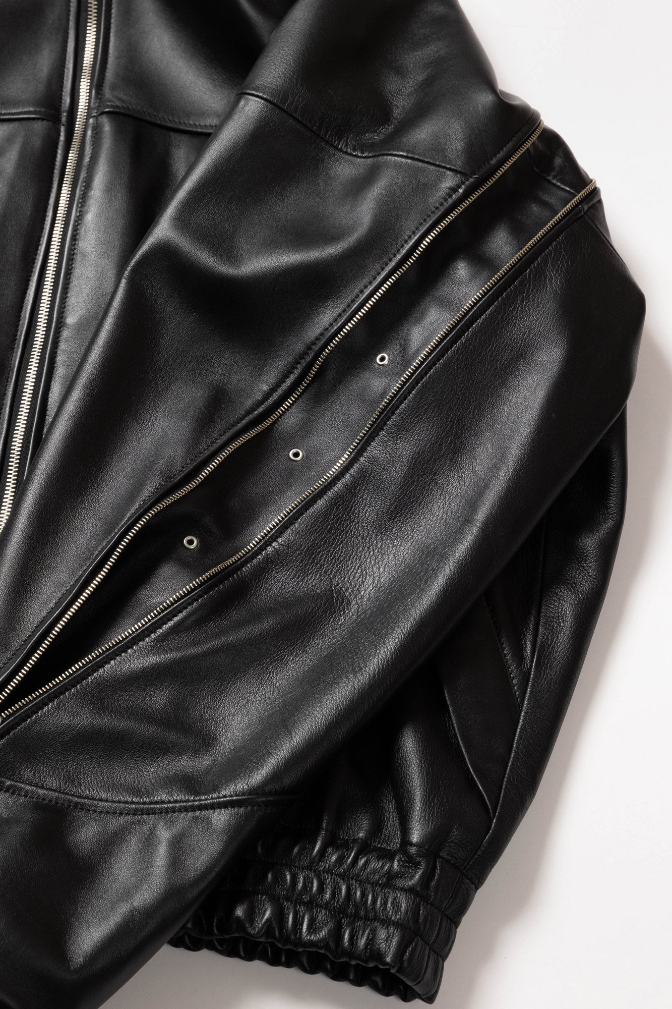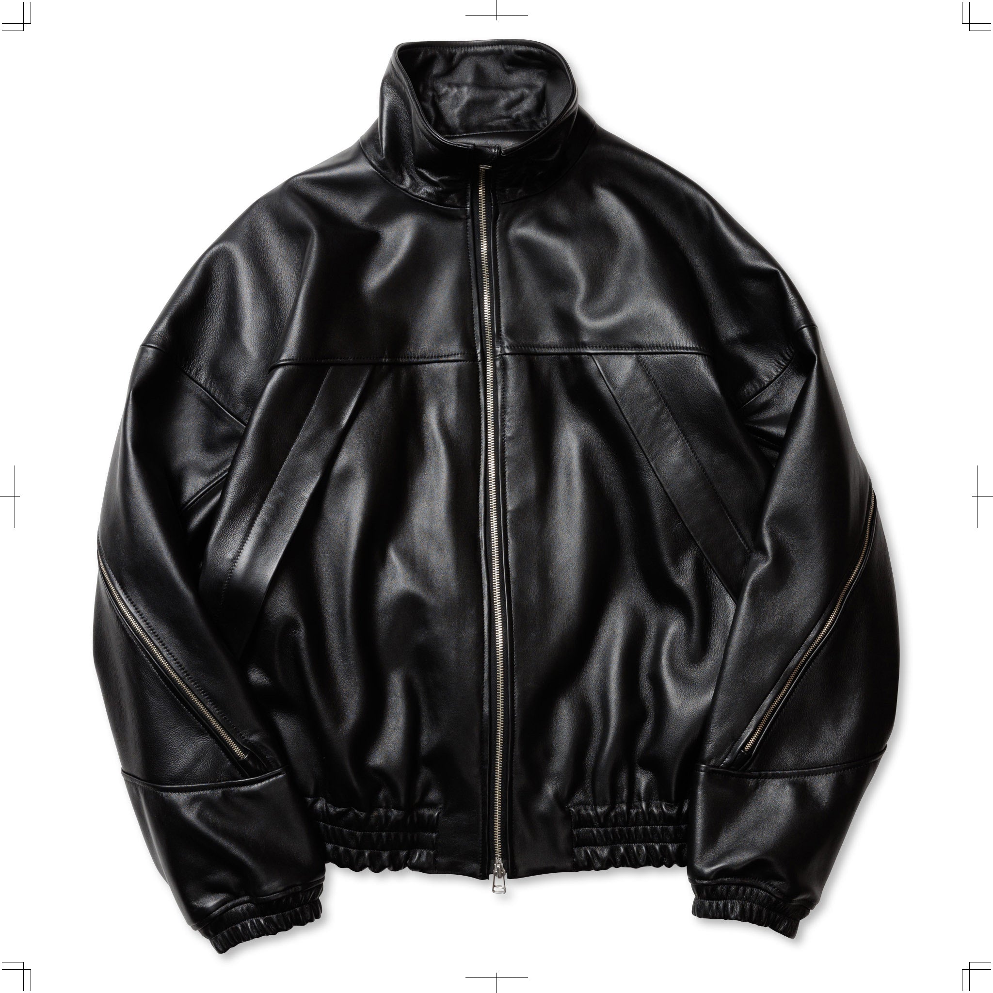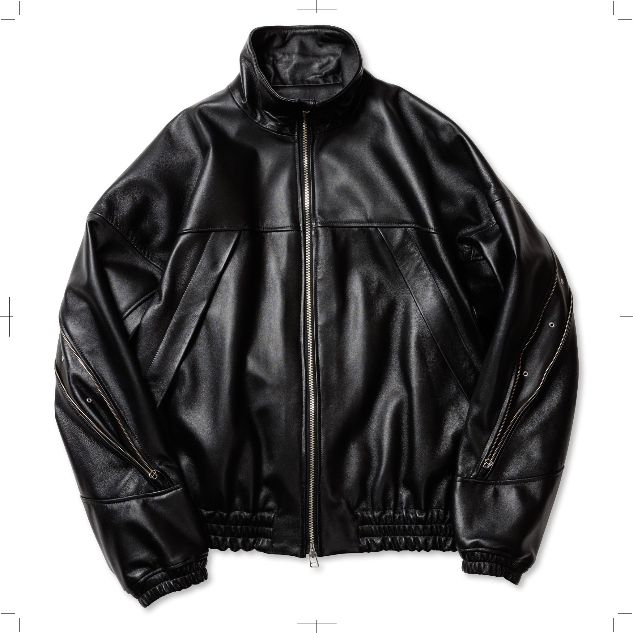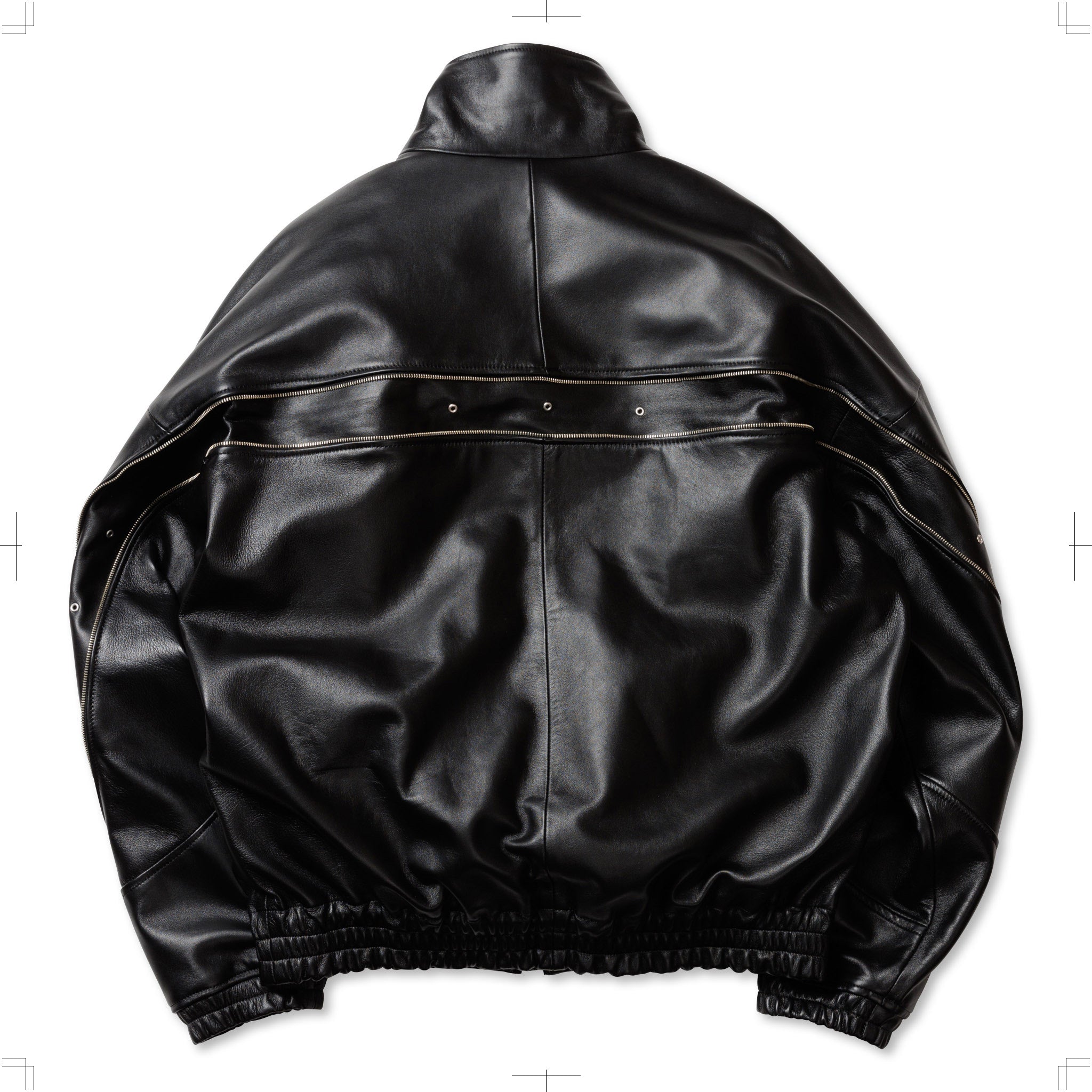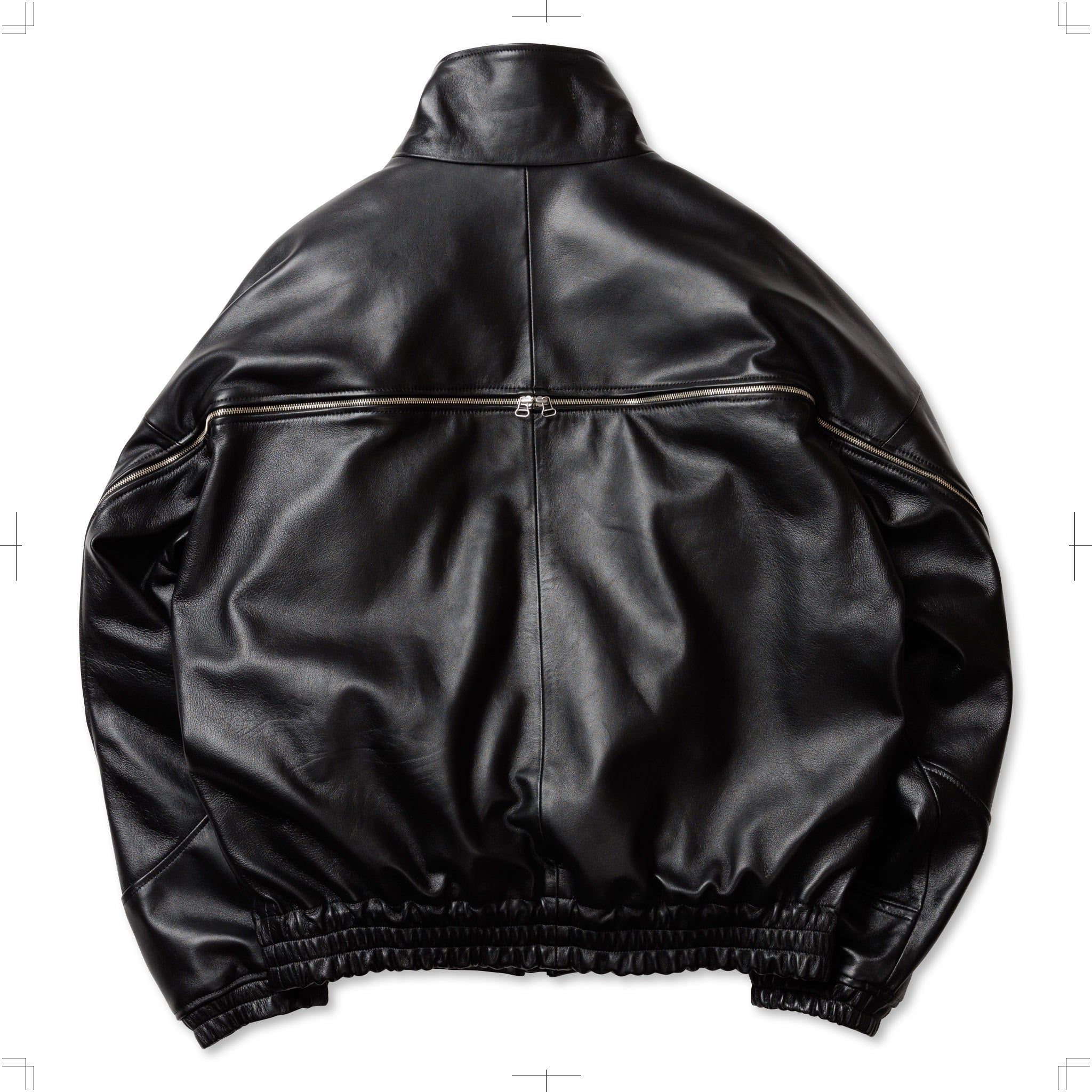 ブラックのシープレザーを使用したフルジップブルゾン。背中のジップは開閉することでシルエットを変化させるだけでなく、ベンチレーションとしての機能も備えている。袖口と裾はゴム仕様。ハの字のジップ内は上下で仕切られており、使い勝手の良い収納システムとなっている。