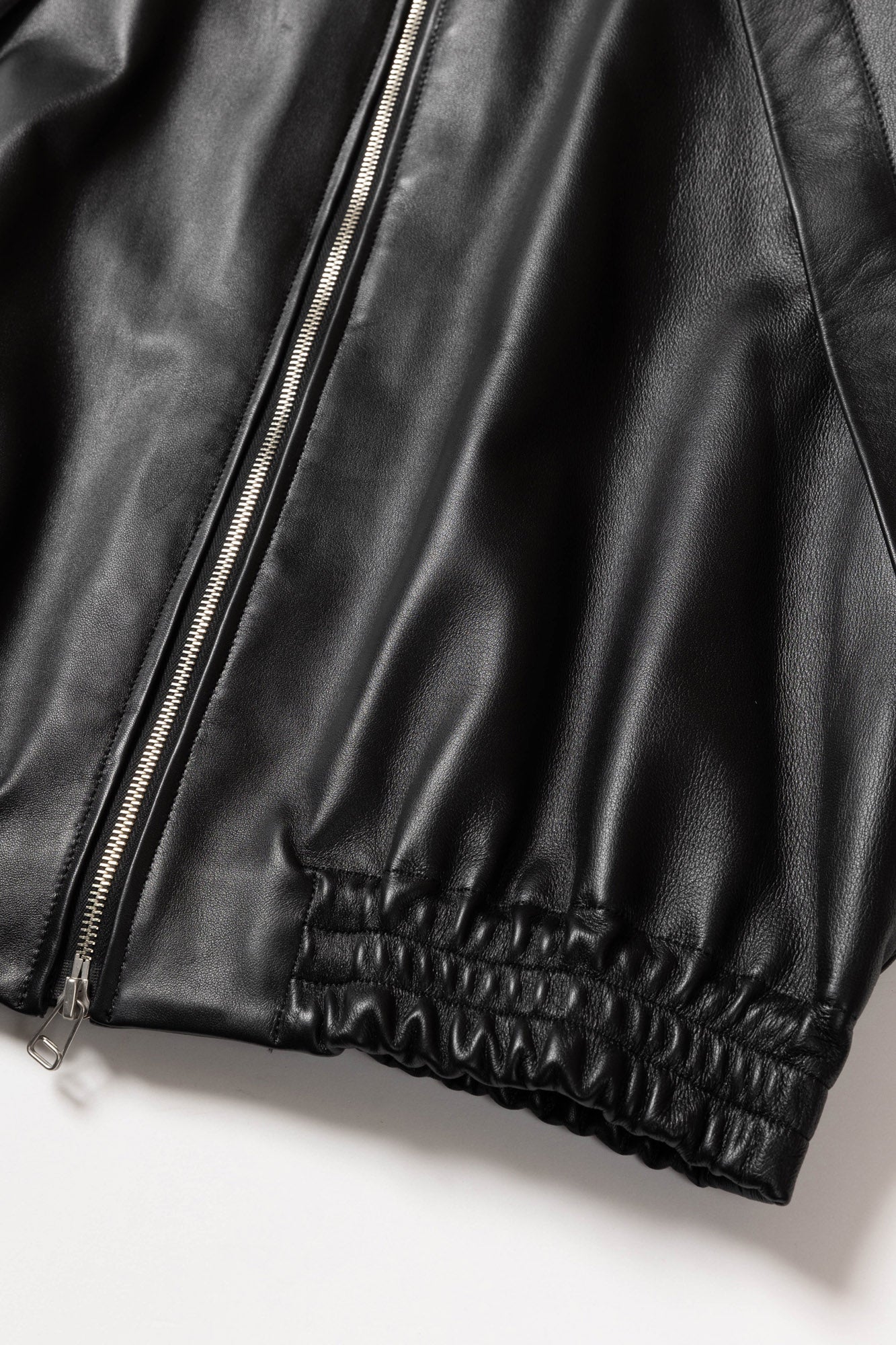 A full-zip blouson made from black sheep leather. The back zipper not only for adjusting the silhouette but also for the function as ventilation. The cuffs and hem feature an elastic design for a comfortable fit. The inside of the zipper pocket divided into upper and lower sections, offering a practical and user-friendly storage system.