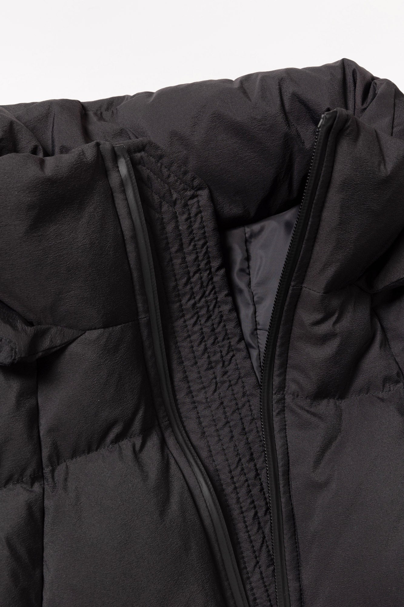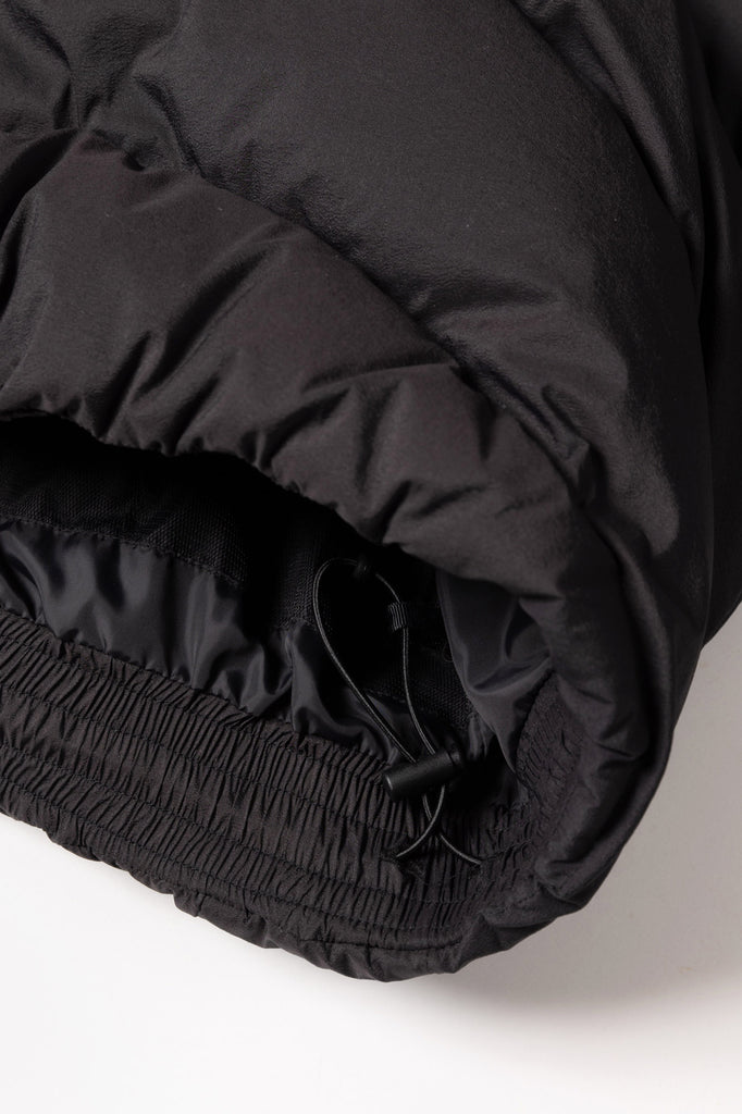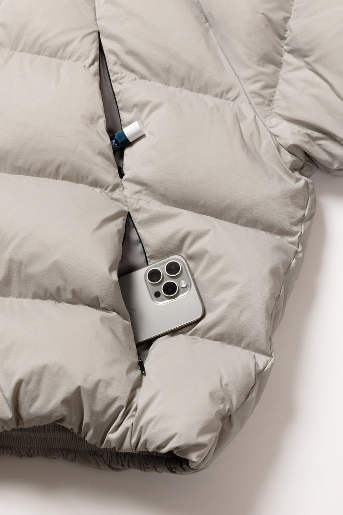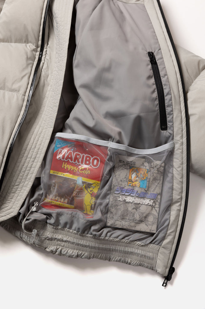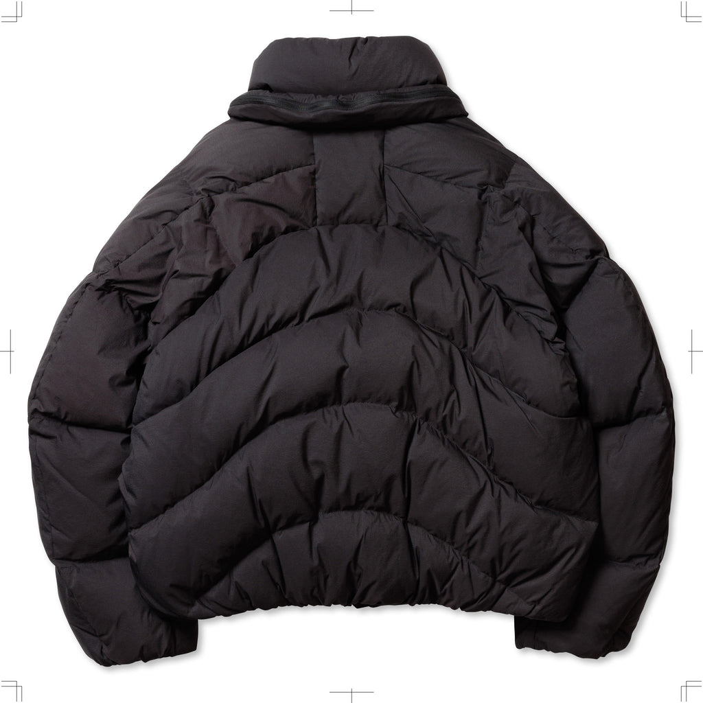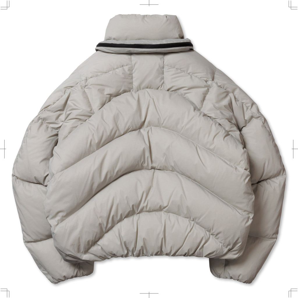 ステッチデザインによるカーブと首に付けられた収納フードが特徴のダウンジャケット。ハの字のジップ内ポケットは上下で仕切られており、フロント内側にはメッシュポケットを採用するなど大容量の収納システムとなっている。肩はラグランスリーブ仕様、袖口と裾口にドローコードを配することでシルエットを調整することも可能。