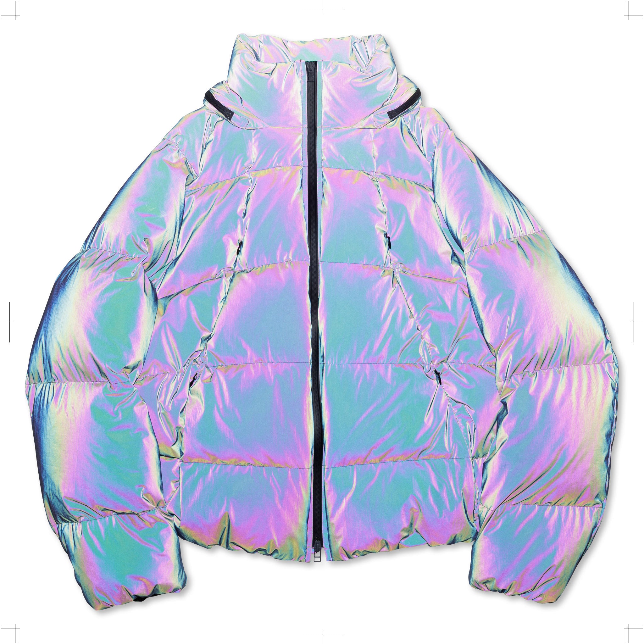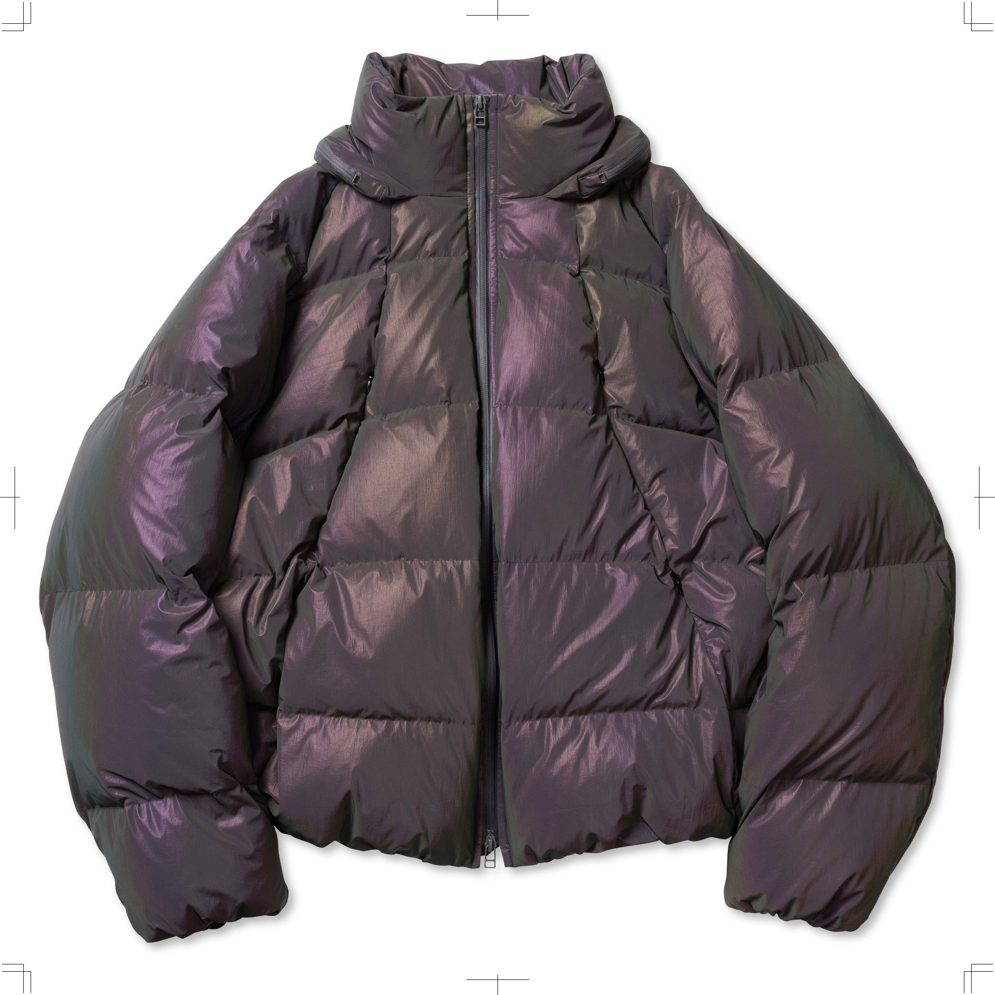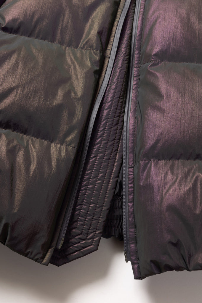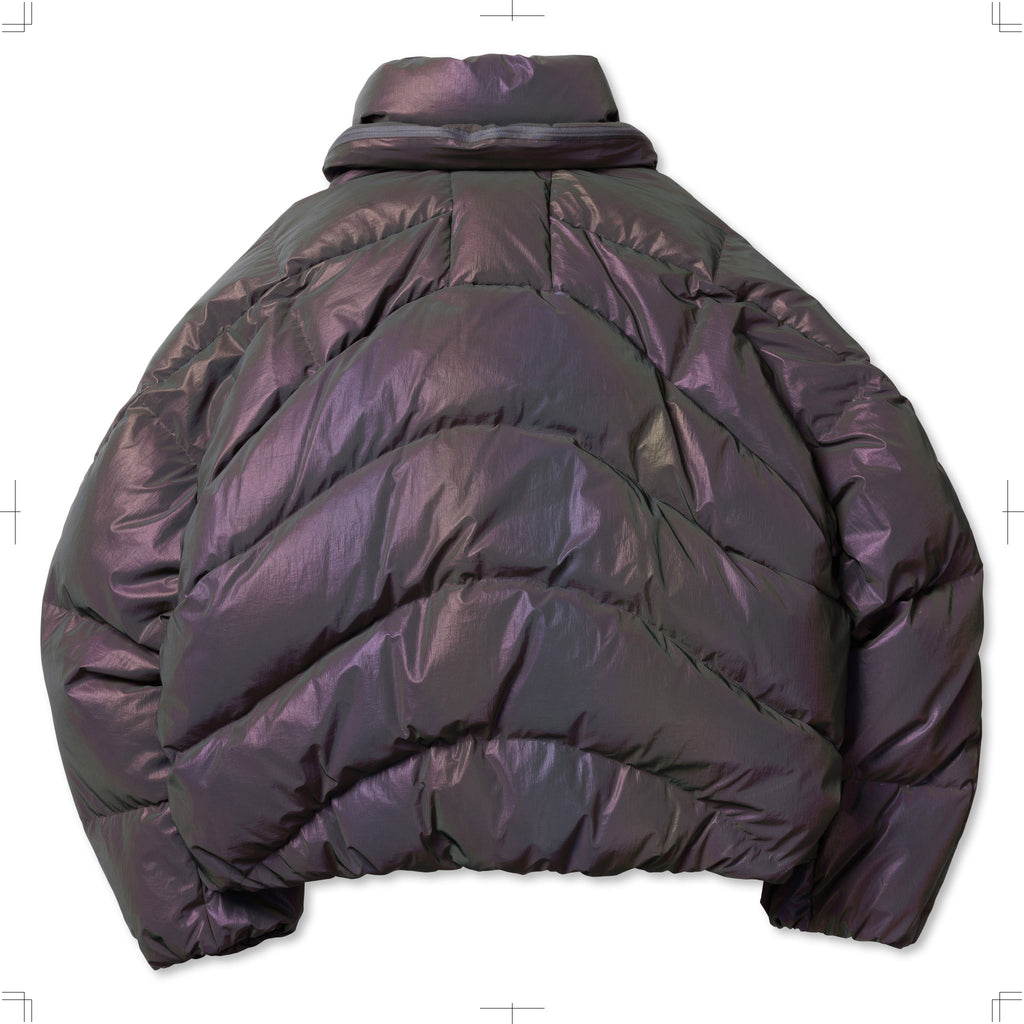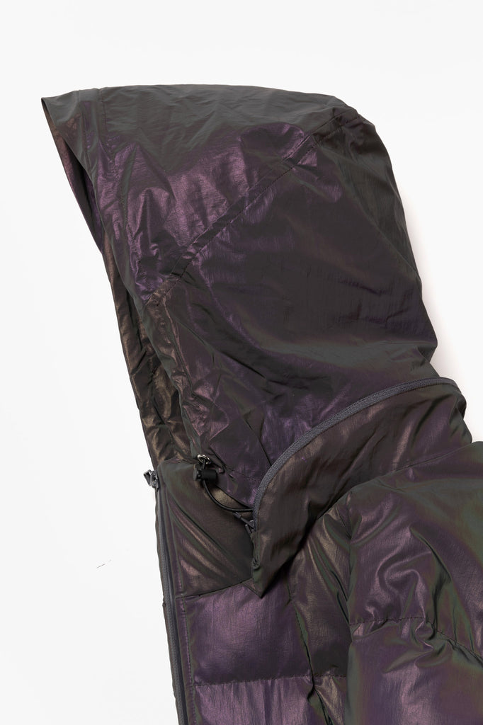 A down jacket featuring curved stitch designs and a stowable hood attached at the neck. It is made from nylon coated with holographic reflective material.The zipper pockets are divided into upper and lower sections, while the inner front includes mesh pockets, providing a high-capacity storage.The jacket is designed with raglan sleeves, and drawcords at the cuffs and hem allow for silhouette adjustments.
