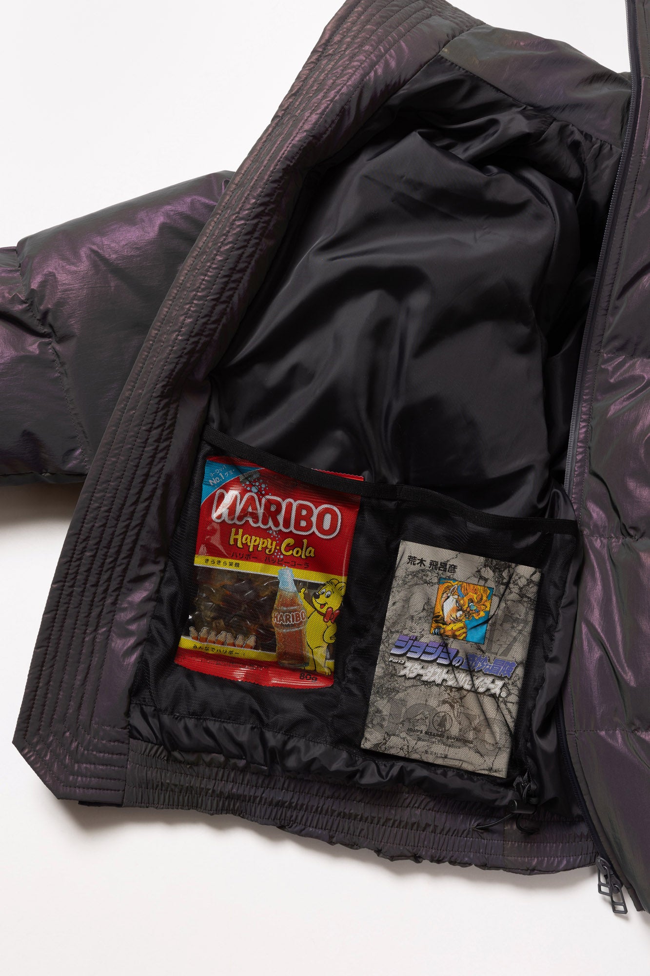 ステッチデザインによるカーブと首に付けられた収納フードが特徴のダウンジャケット。ホログラフィック反射素材をコーティングしたナイロン素材を使用。ハの字のジップ内ポケットは上下で仕切られており、フロント内側にはメッシュポケットを採用するなど大容量の収納システムとなっている。肩はラグランスリーブ仕様、袖口と裾口にドローコードを配することでシルエットを調整することも可能。