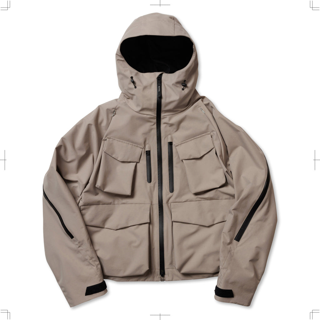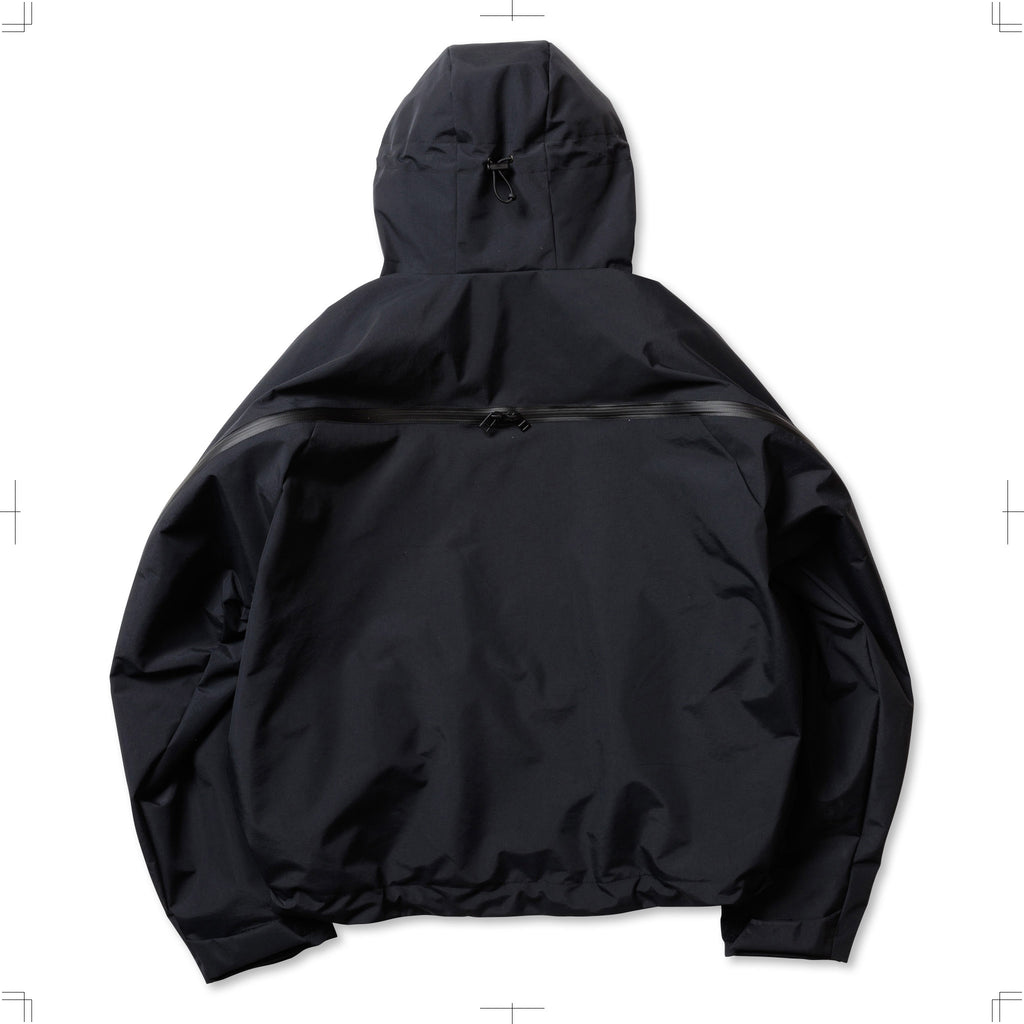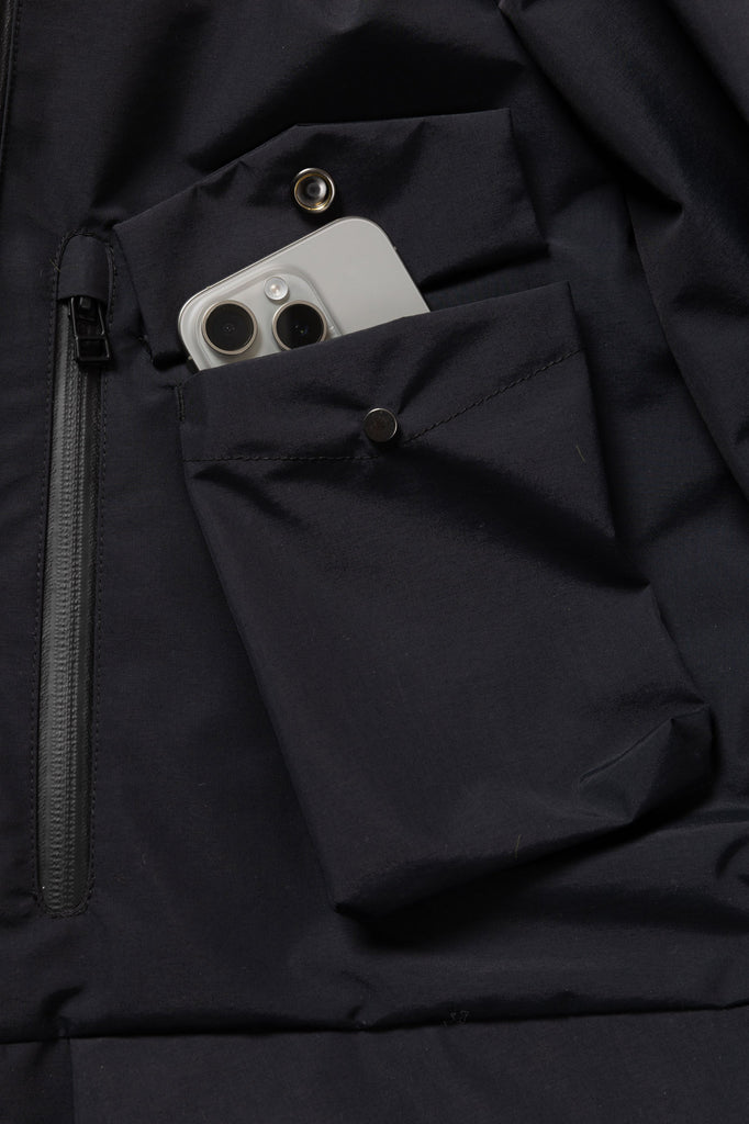 A shell parka made from nylon with excellent breathability and waterproof performance. The front features a waterproof zipper, while a ventilation zipper is on the chest, using different components for each functional detail. A zipper on the back allows for silhouette adjustment, and reflective material is used on the inside.The hood is equipped with two types of drawcords around the face for a better fit. The waist pockets include two types: hand-warmer pockets and magnet-closure pockets for versatile use. The cuffs are designed with Velcro adjuster, while the inner layer features windguard. A drawcord at the hem allows for silhouette adjustment.