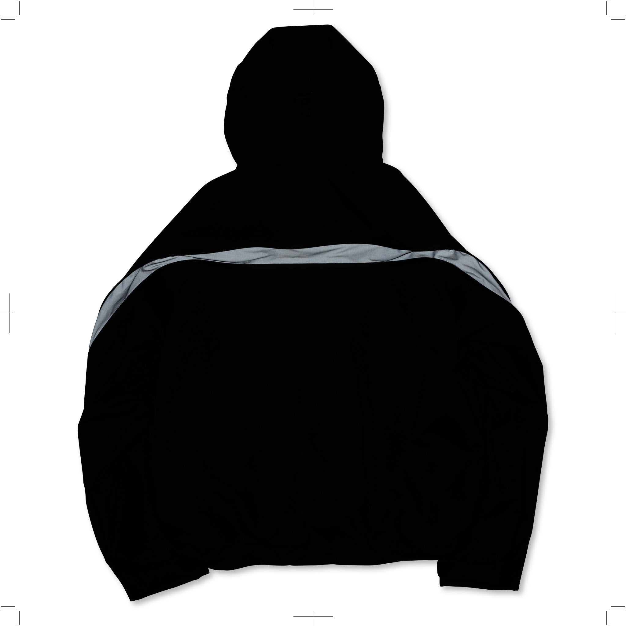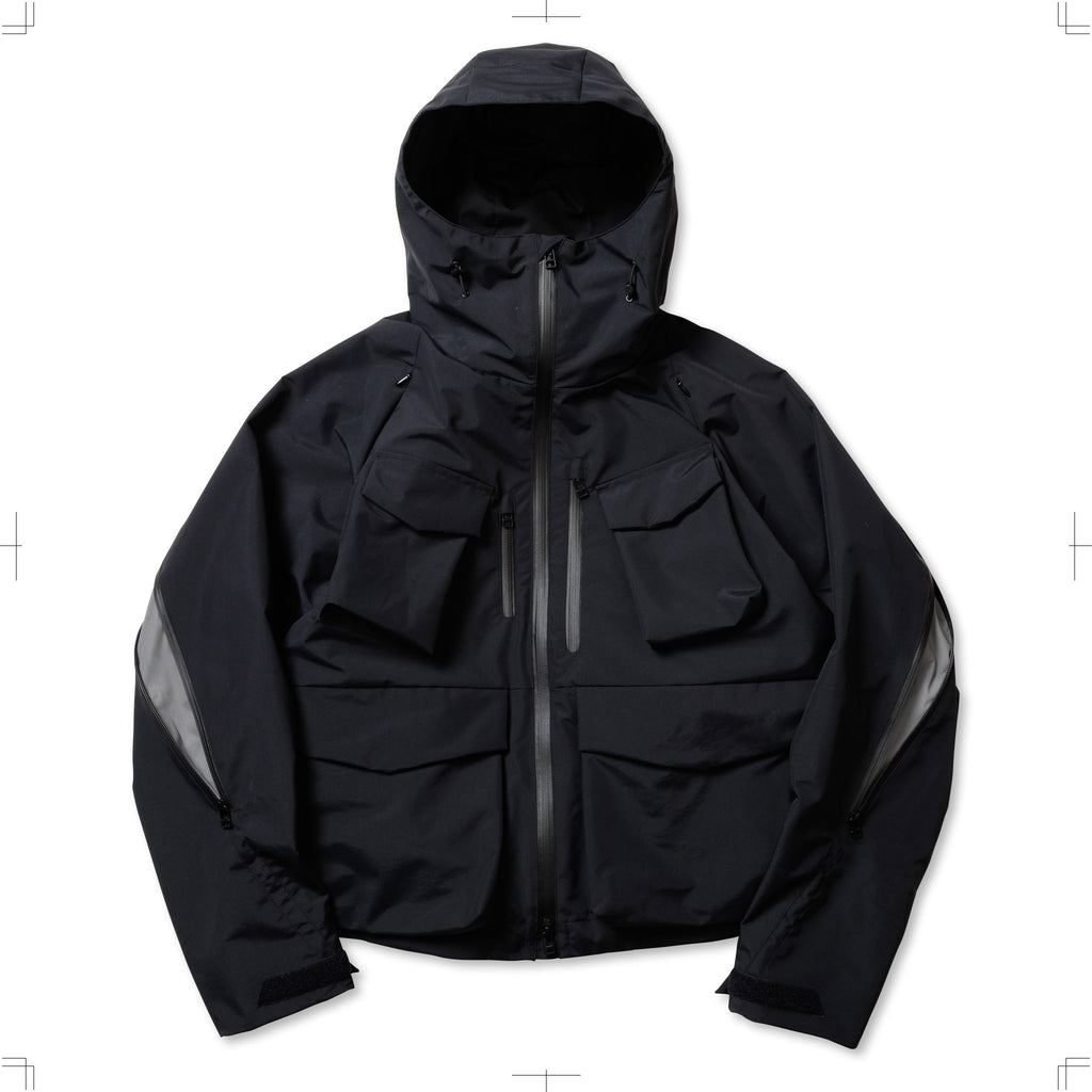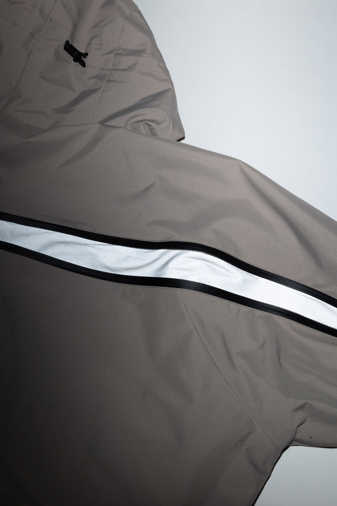 透湿防水機能に優れたナイロンを使用したシェルパーカ。フロントには止水ジップ、胸部にはベンチレーション用のジップを使用し、ディテールごとにパーツを使い分けている。背中にはシルエットを変化させるジップが配され、内側には反射素材を使用。フードはフィット感を高めるため、顔周りに二種類のドローコードを搭載。腰ポケットにはハンドウォーマー仕様とマグネットボタン仕様の用途によって使い分けられる2種のポケットを採用。袖口はベルクロ、内側には風よけ、裾にはシルエットを調節するためのドローコードを採用。