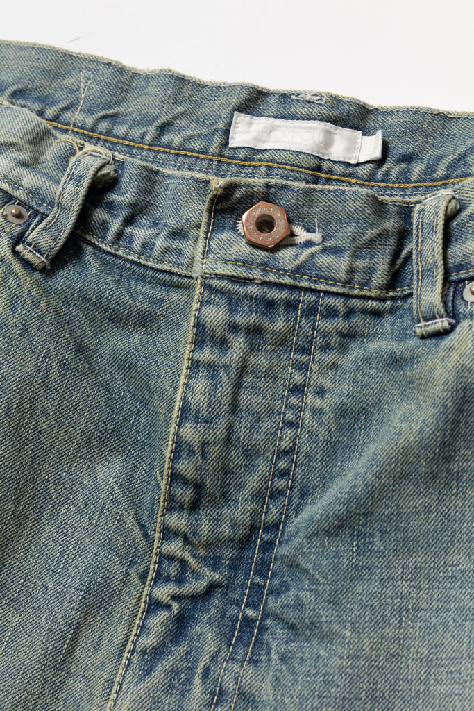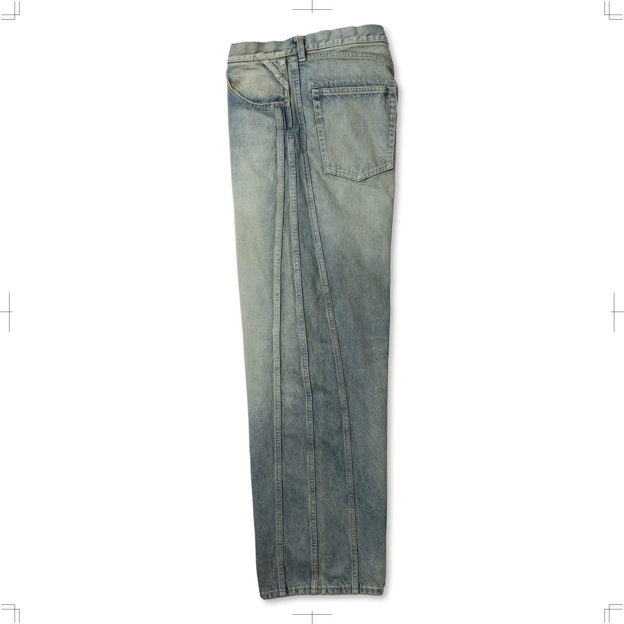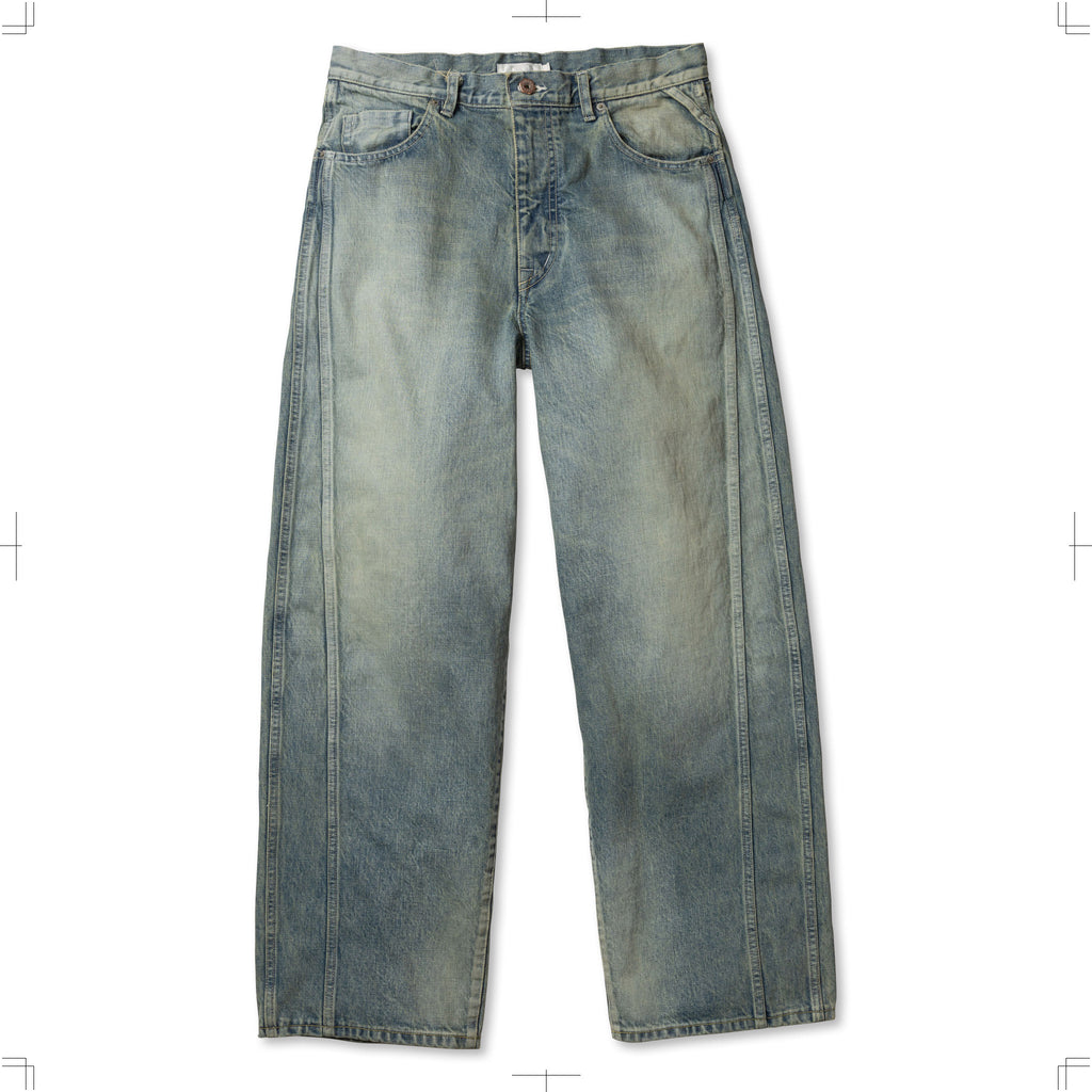 サイドシームが3本配置されたワイドシルエットの6ポケットデニム。13ozデニムを採用し、右前部にはコインポケット、左前部にはキーホルダー用ループを備え、腰部のパッチは小さなポケットにアレンジ。バックポケットには補強用テープを配し、一本のデニムに多機能なディテールを凝縮。製品洗いやダメージなど職人による手作業の加工を施している。製品加工商品のため個体差が生じます。