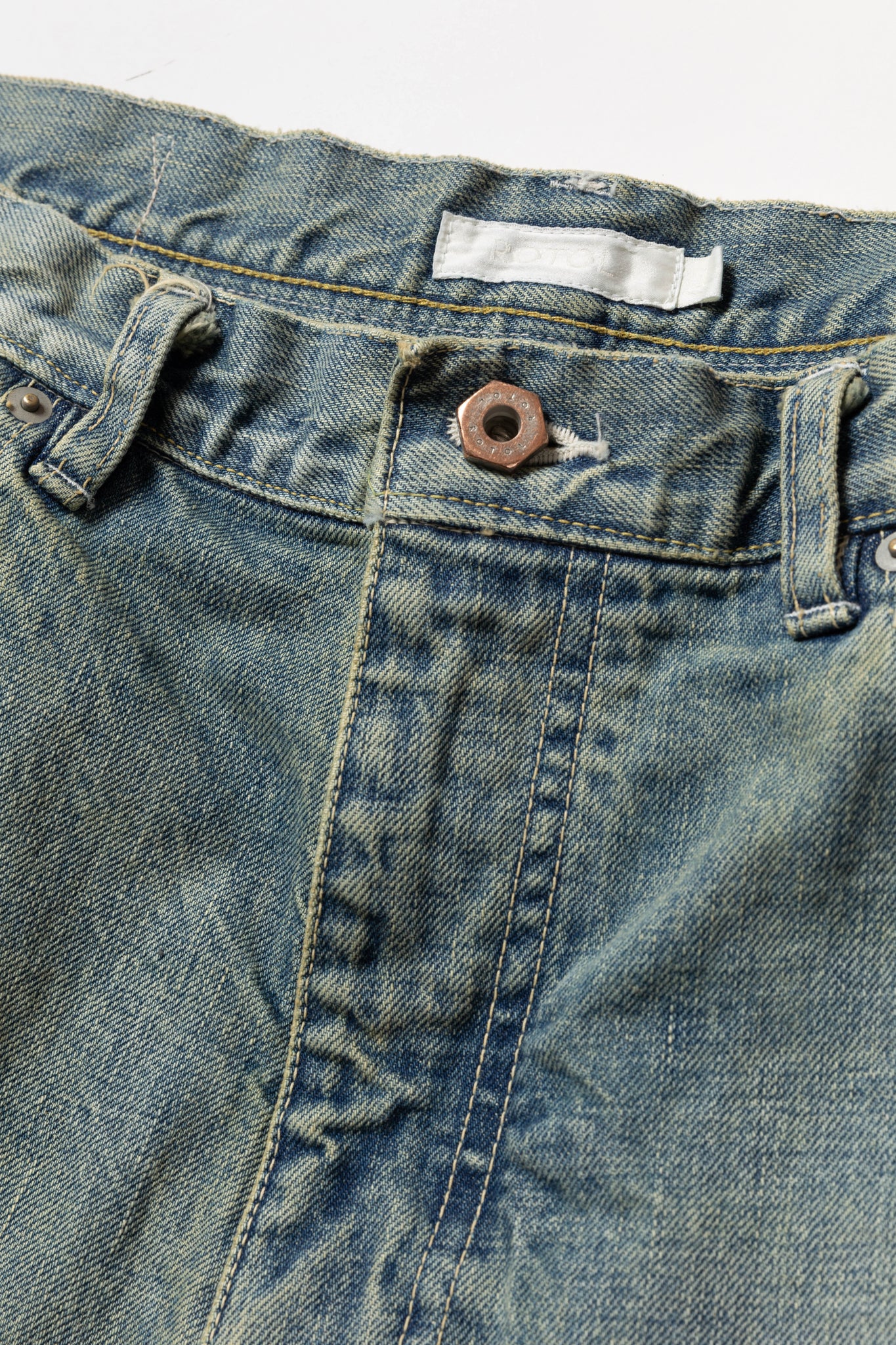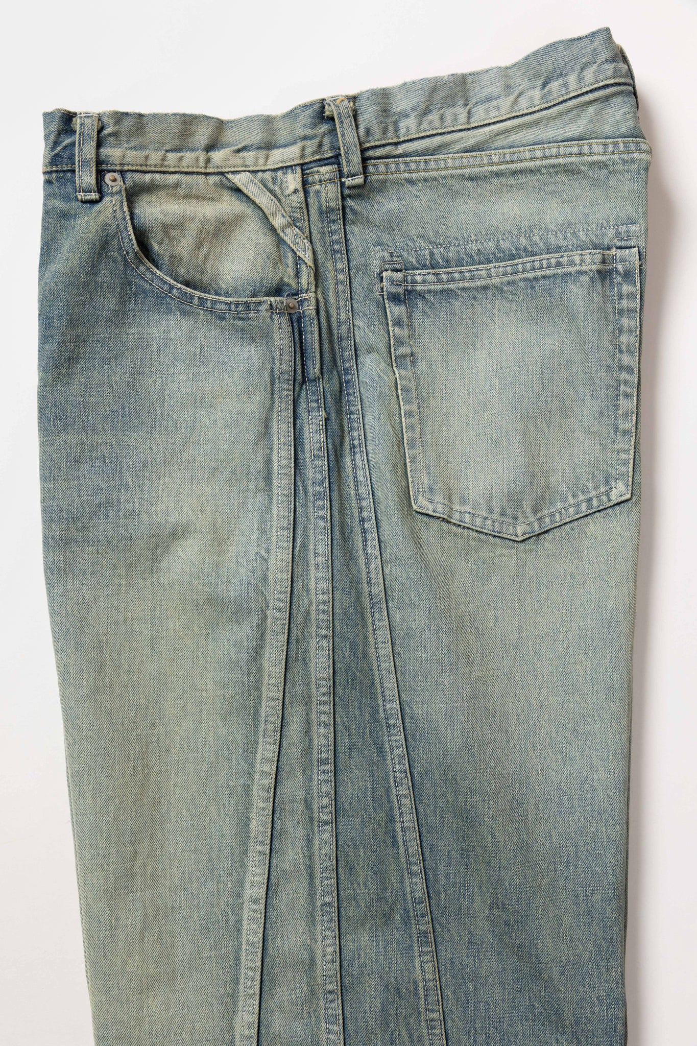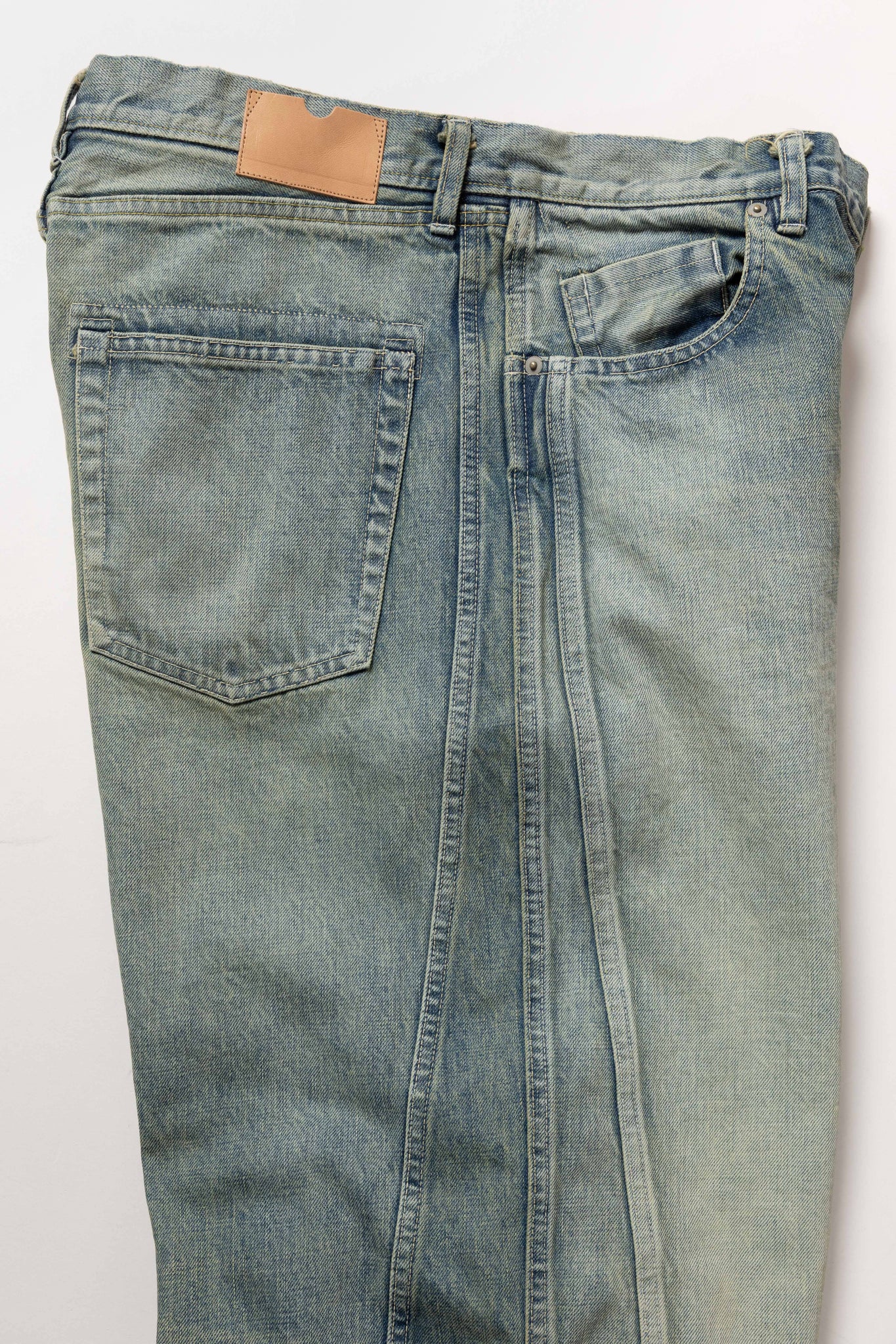 Wide-silhouette 6-pocket denim featuring three side seams. Made from 13oz denim, it includes a coin pocket on the right front, a keyring loop on the left front, and a small pocket on the waistband patch. The back pockets are reinforced with tape, concentrating multifunctional details into a single pair of denim. The product has been hand-finished with techniques such as product washing and damage processing by artisans. Due to the product finishing, there may be variations in each piece.