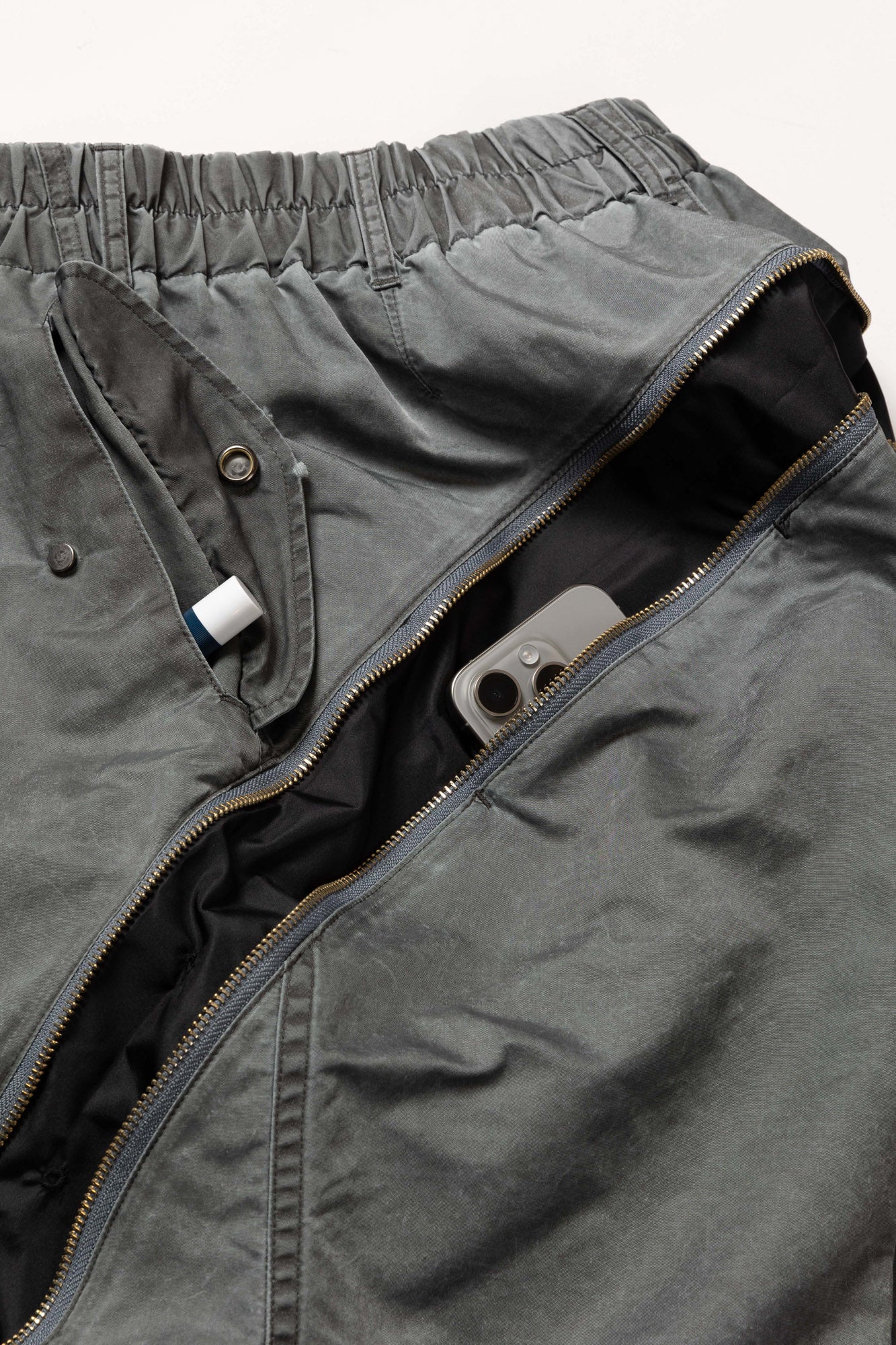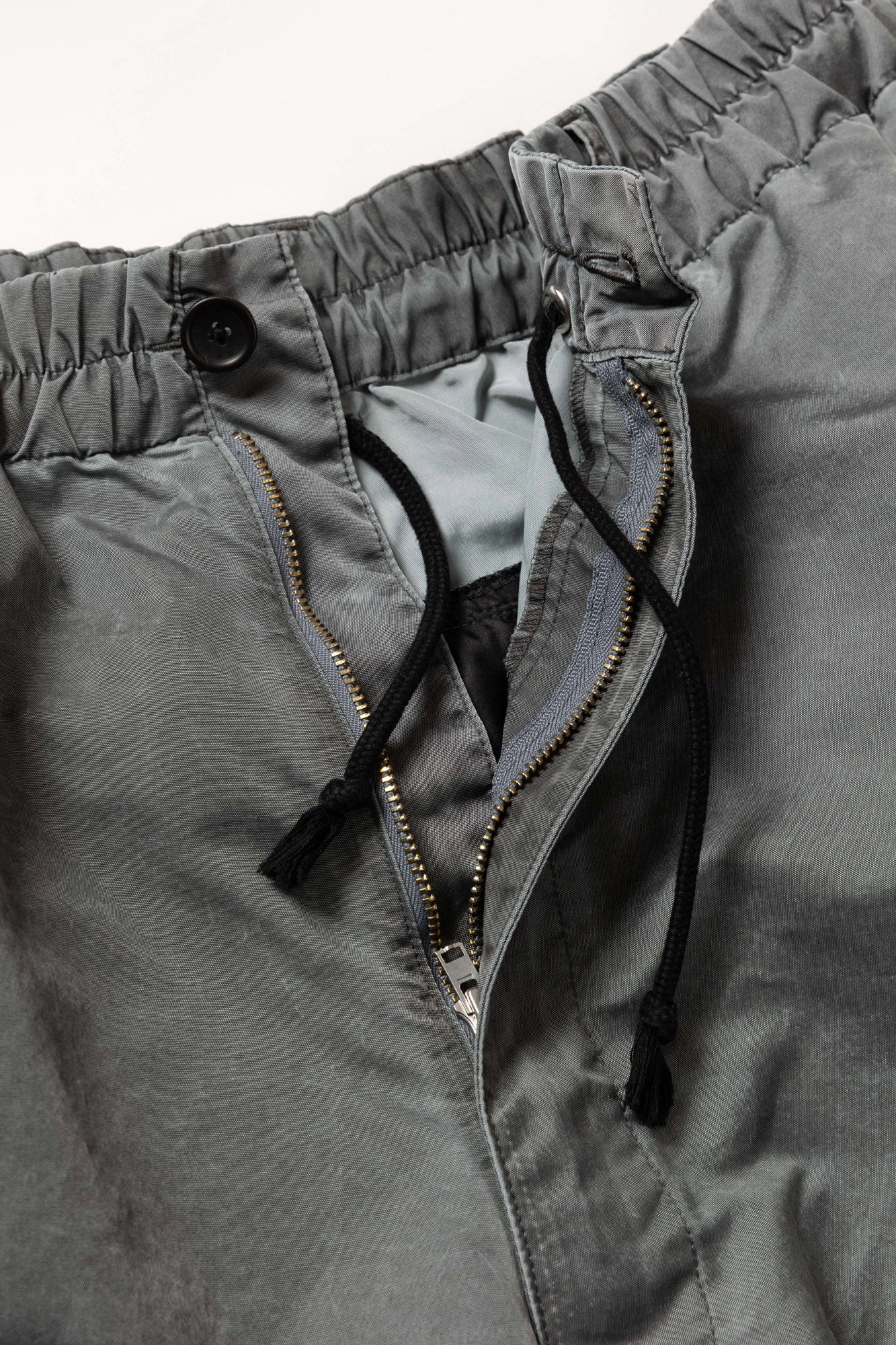 Cargo pants based on an overpants design. Made from nylon oxford fabric with a pigment print, the product finishing creates a stone-like texture and puckering effect. The zipper running from the back around to just below the front knee allows for silhouette adjustments. The waistband features elastic and a drawstring, and the hem is also equipped with a drawstring. Due to the product finishing, there may be variations in damage and individual differences.