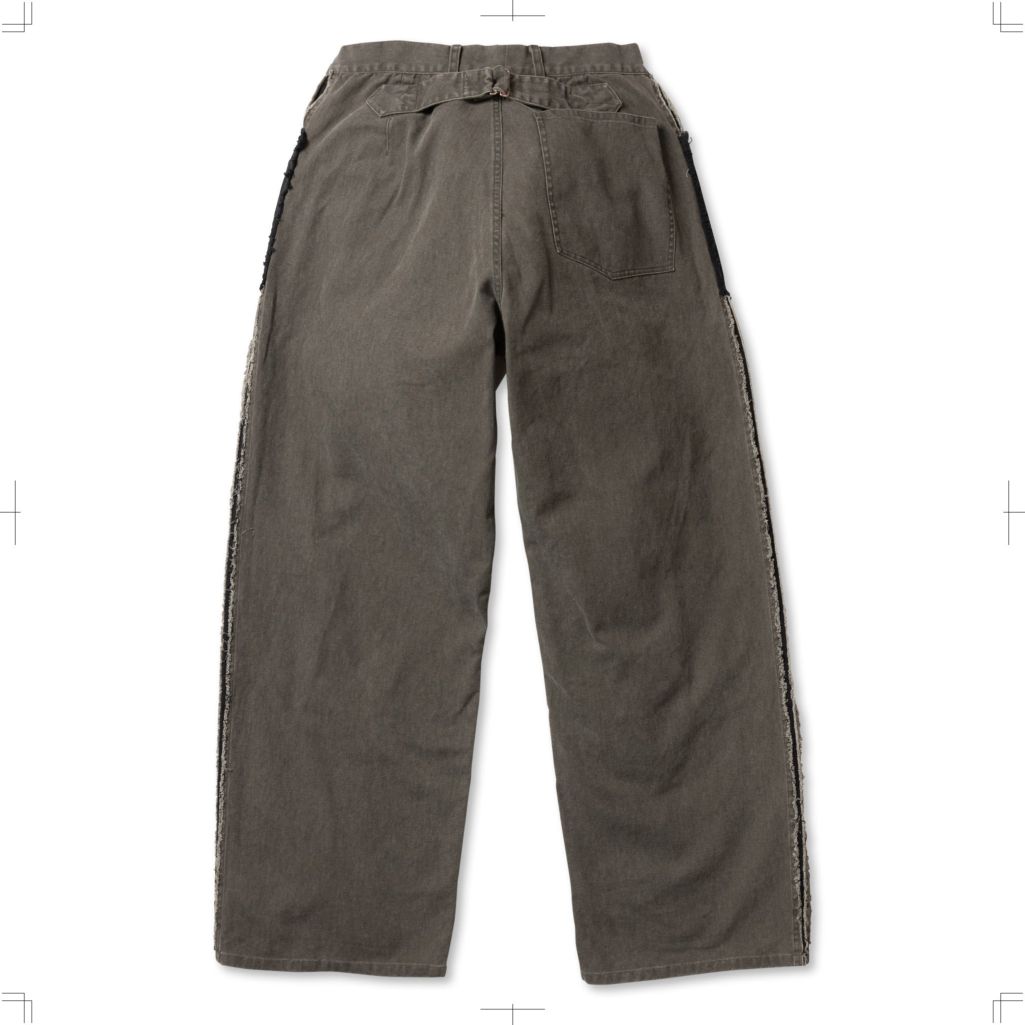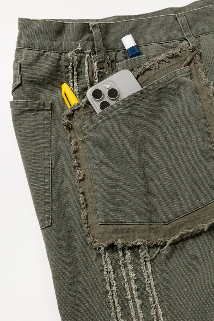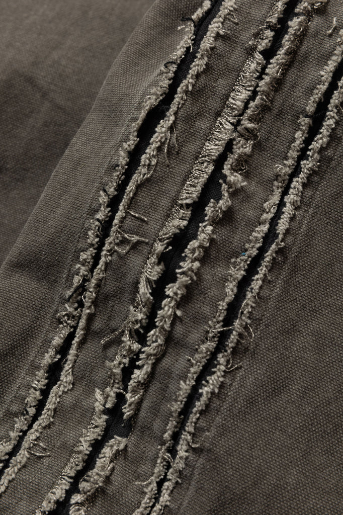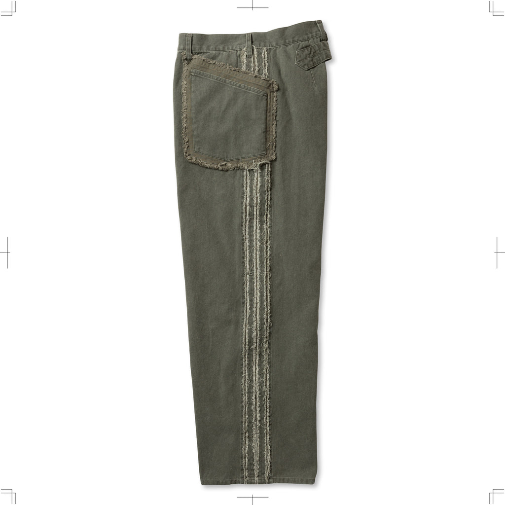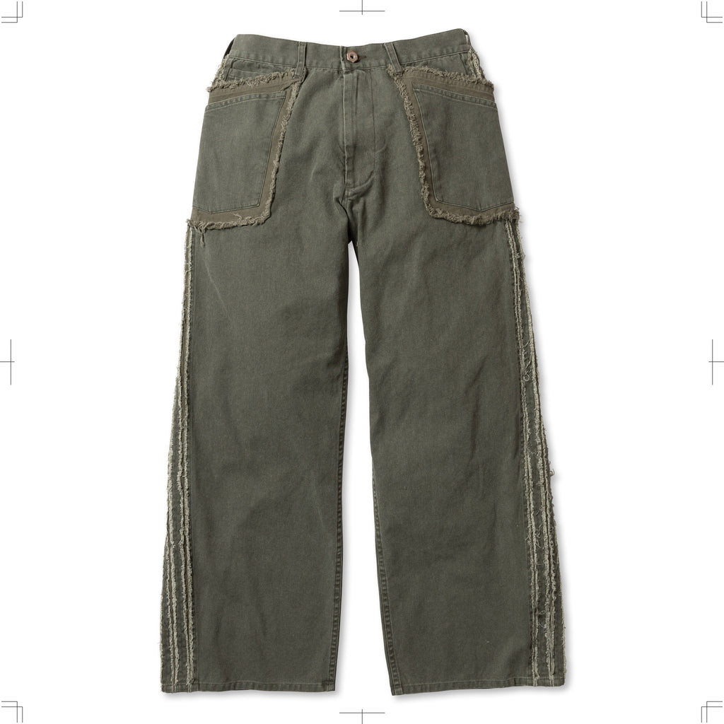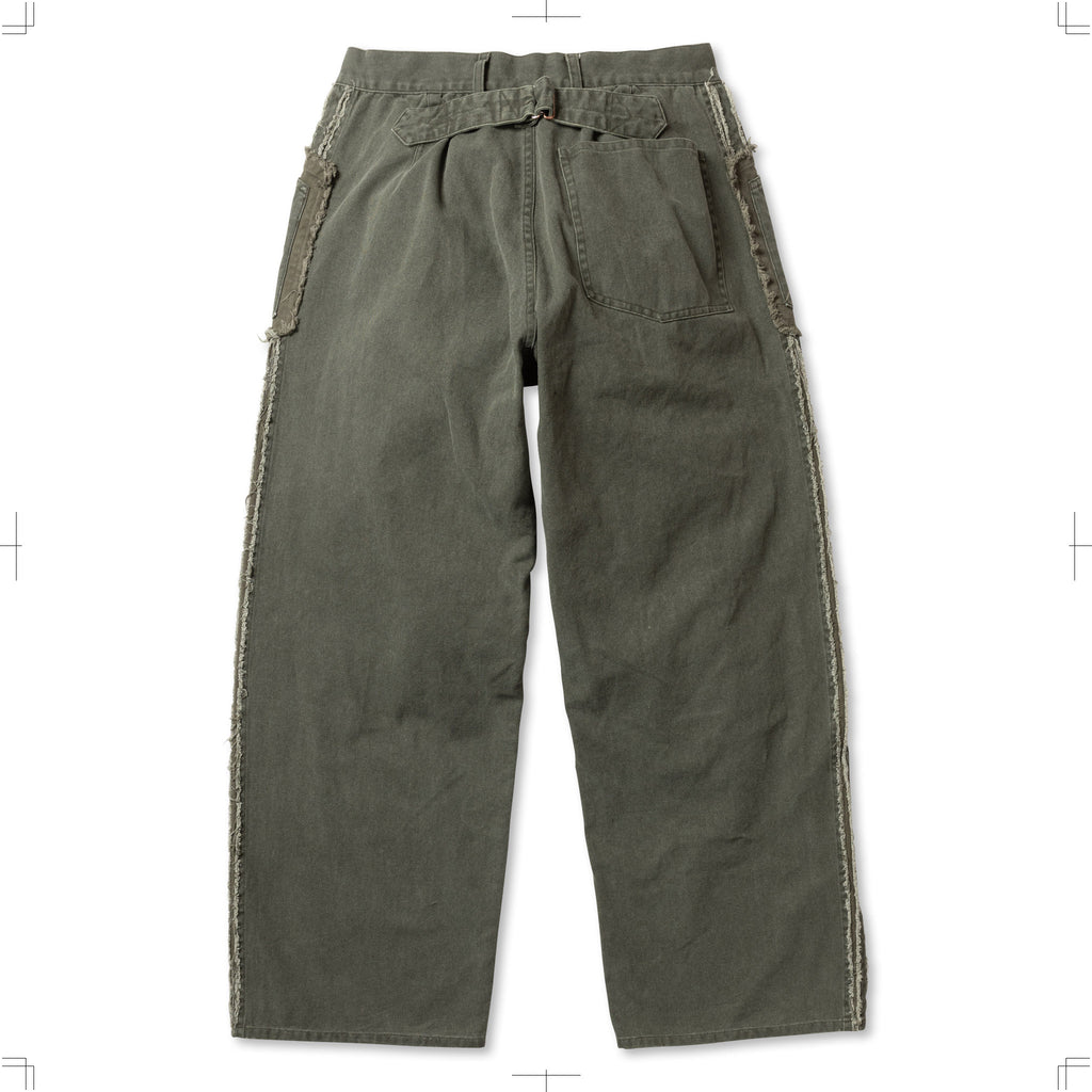 ダック素材のワークトラウザー。キャンバスに顔料プリントを施し、製品加工により着古したダックのような風合いを表現。フロントポケットは二重の袋を配し、脇にはスラッシュキルト加工を施している。製品加工商品のため個体差が生じます。