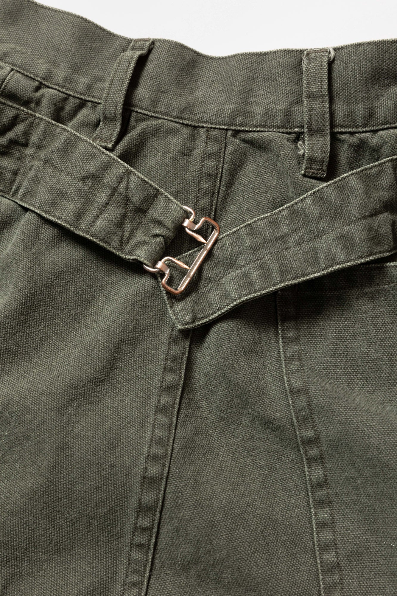 Work trousers made from duck fabric. The fabric is processed with a pigment print, and the product finishing creates a worn-in texture similar to aged duck fabric. The front pockets feature double-layered bags, and slash quilting is applied to the sides. Due to the product finishing, there may be variations in each piece.