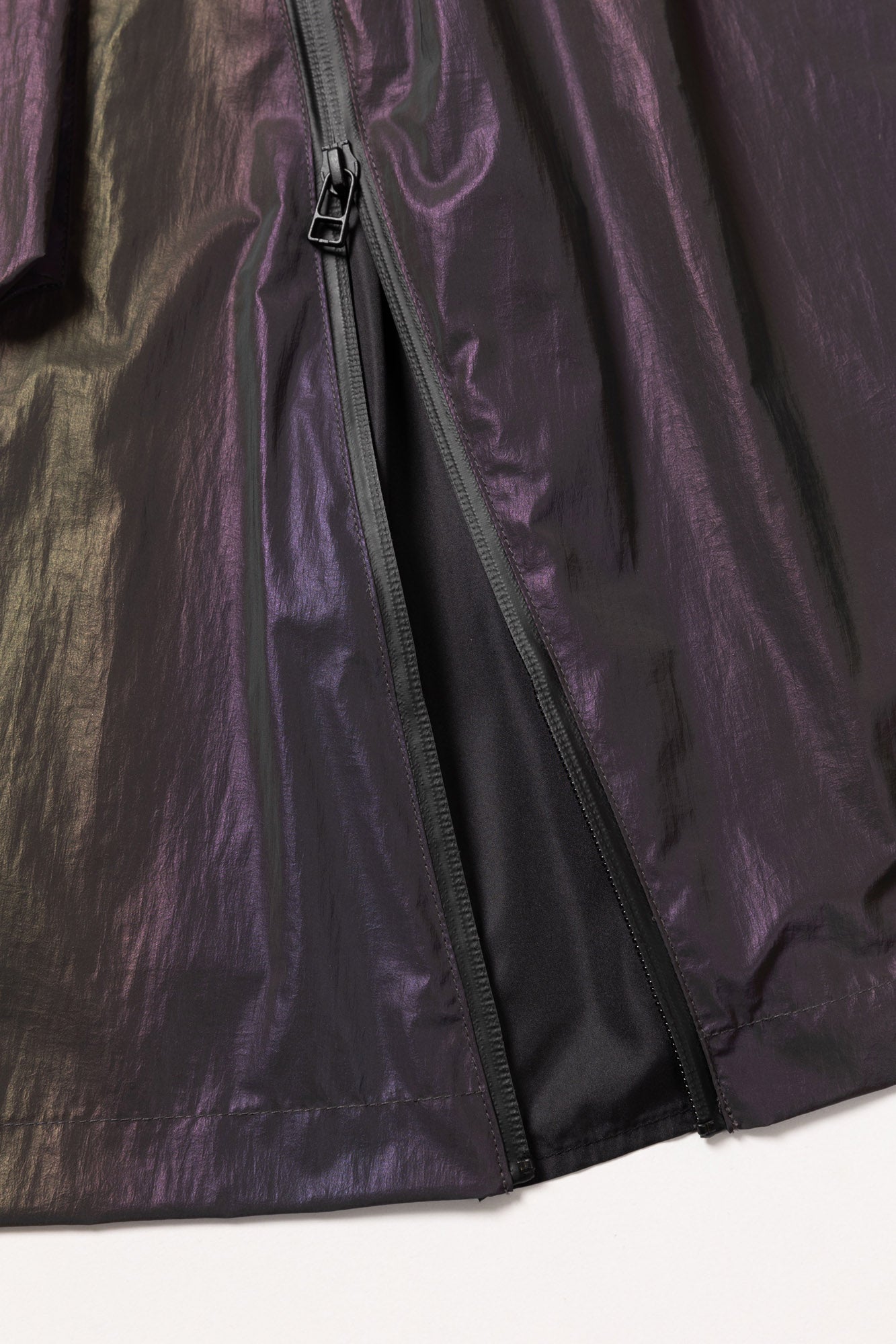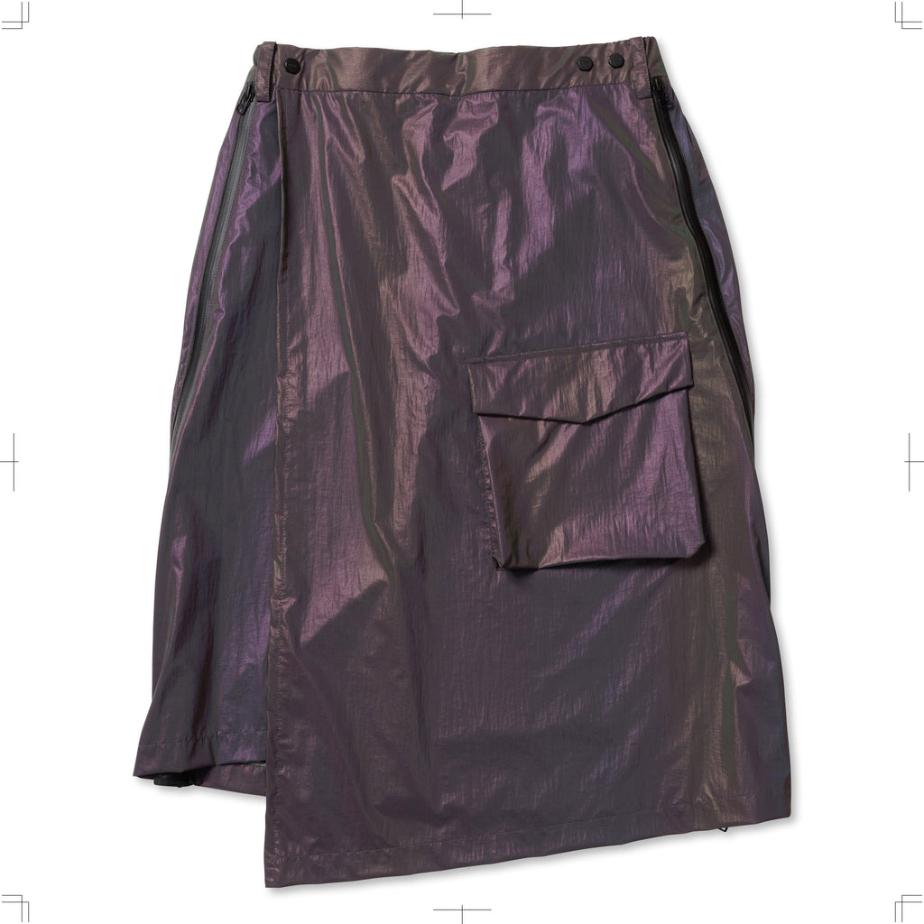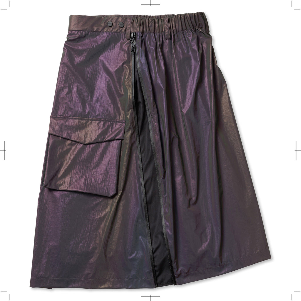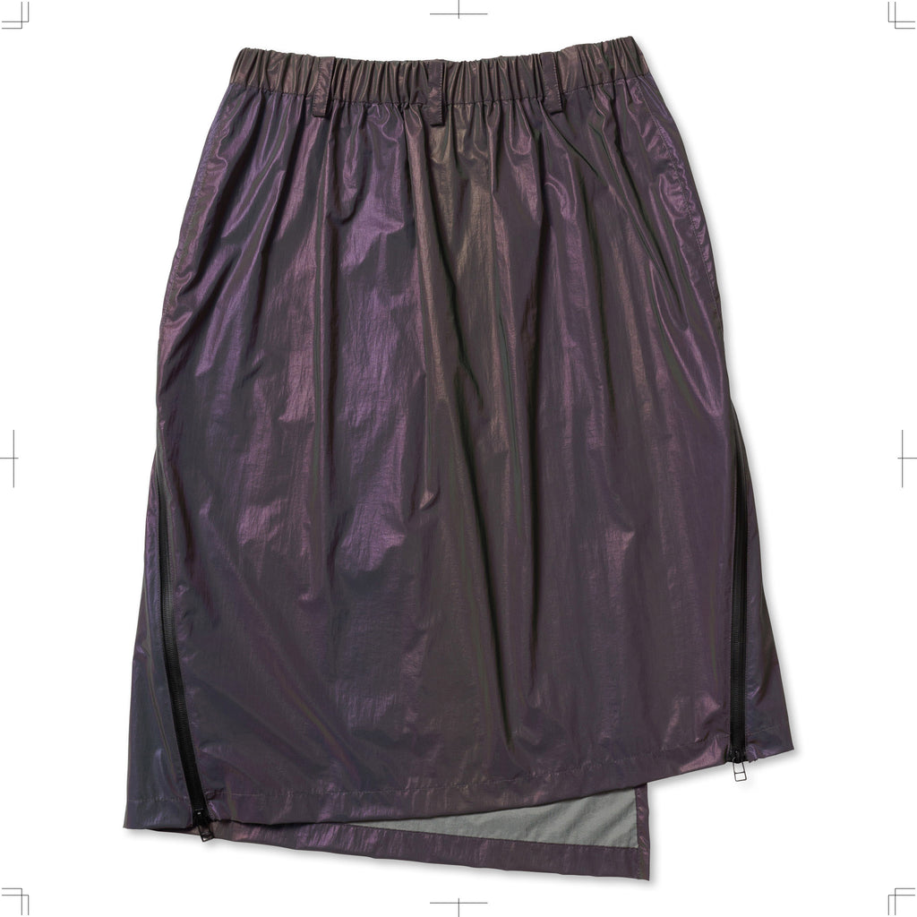 ホログラフィック反射素材をコーティングしたナイロンラップスカート。サイドにはシルエットを変化させるジップを配置。ウエストにはゴム、前開きは脱着しやすいドットボタンを採用。