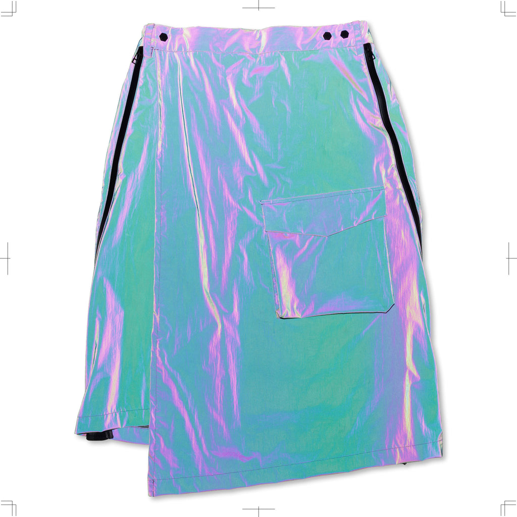 A nylon wrap skirt coated with holographic reflective material. A zipper on the side allows for silhouette adjustment. The waist is elasticated, and the front opening features snap buttons for easy wear and removal.