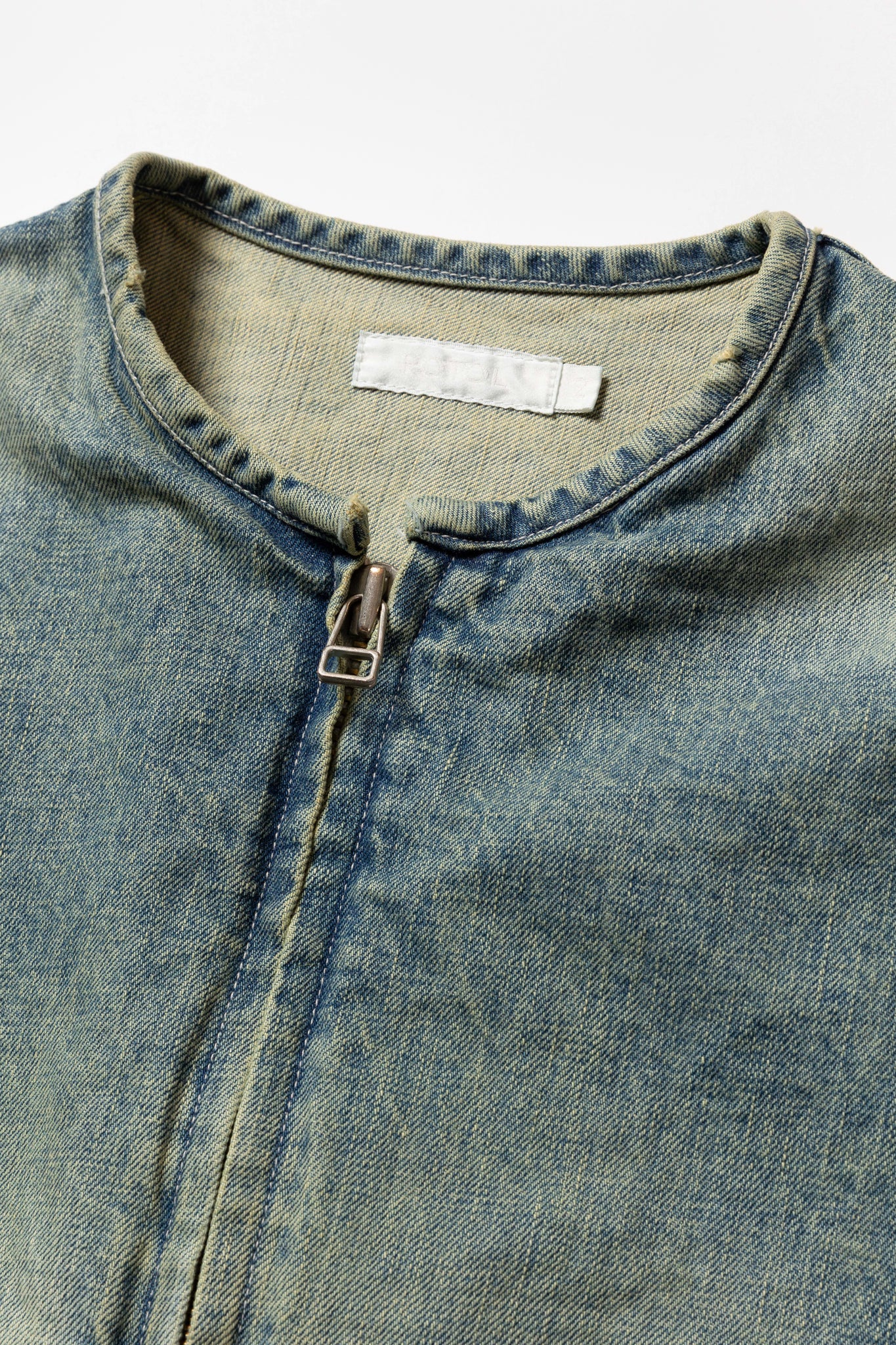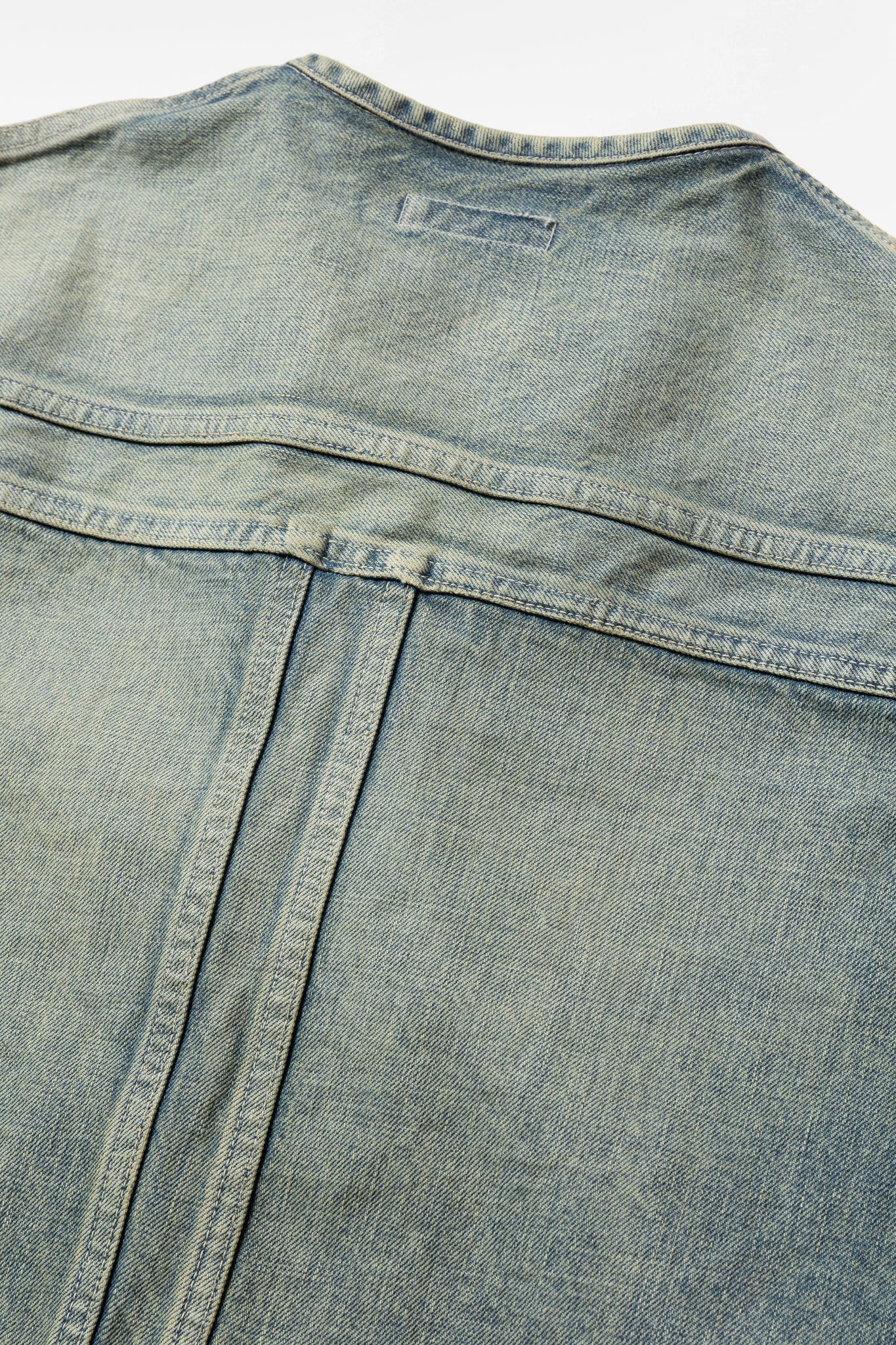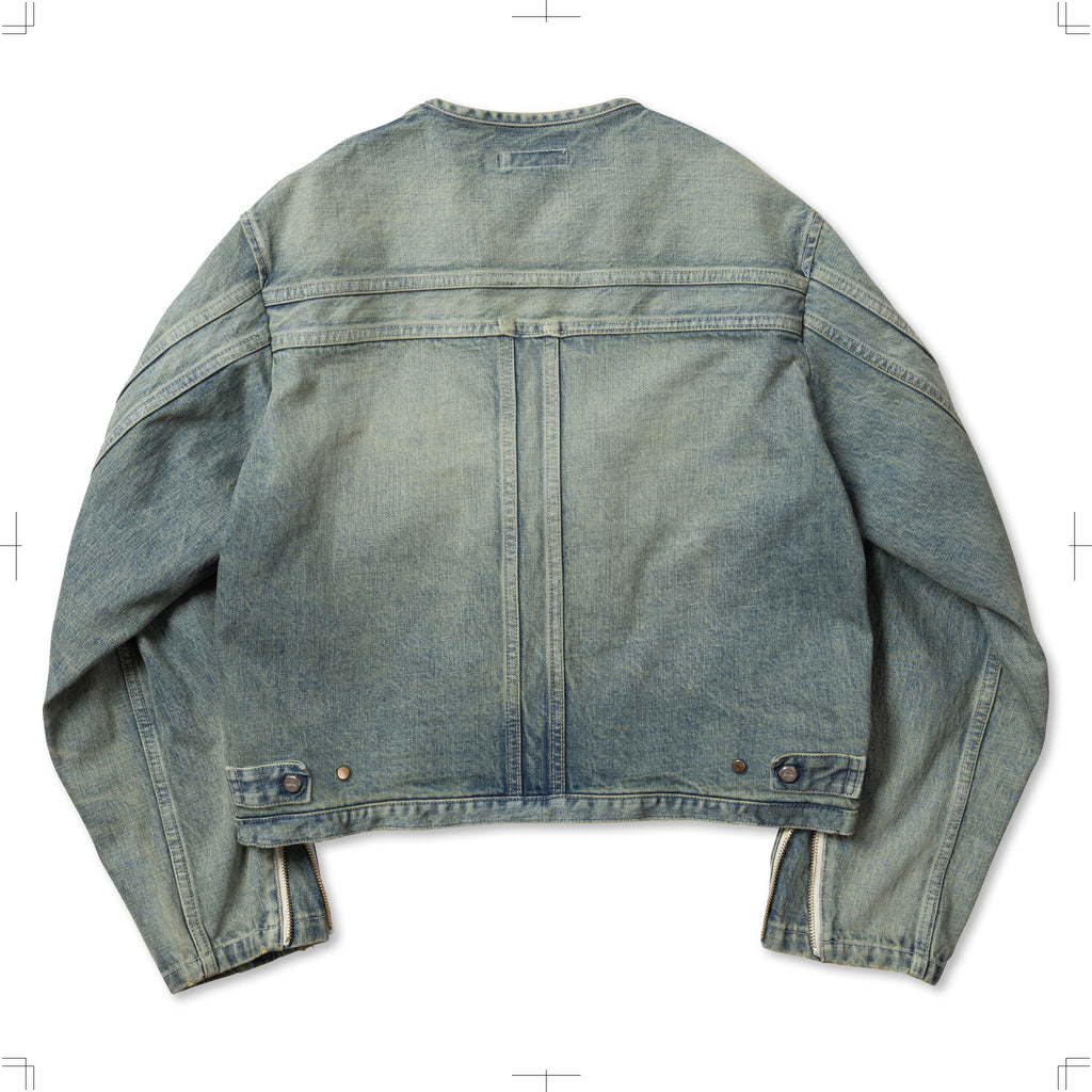 A denim jacket based on a single riders design. The front is finished with a minimalistic design, while the back features a double T-back switch for a rugged look. Made from thick 13oz denim. Due to the product finishing, there may be variations in each piece.