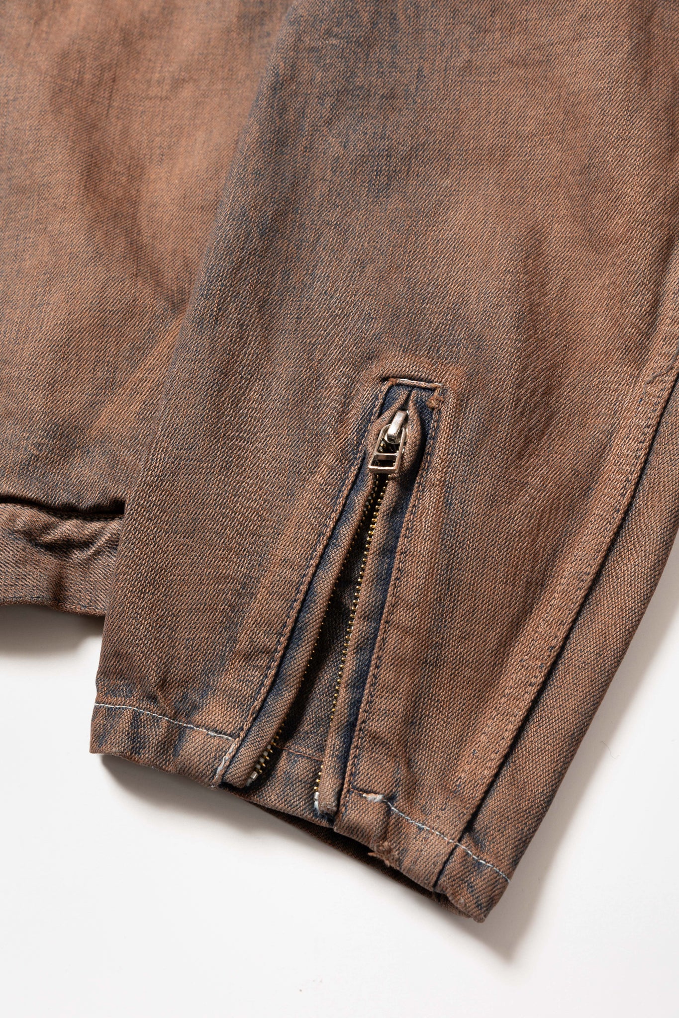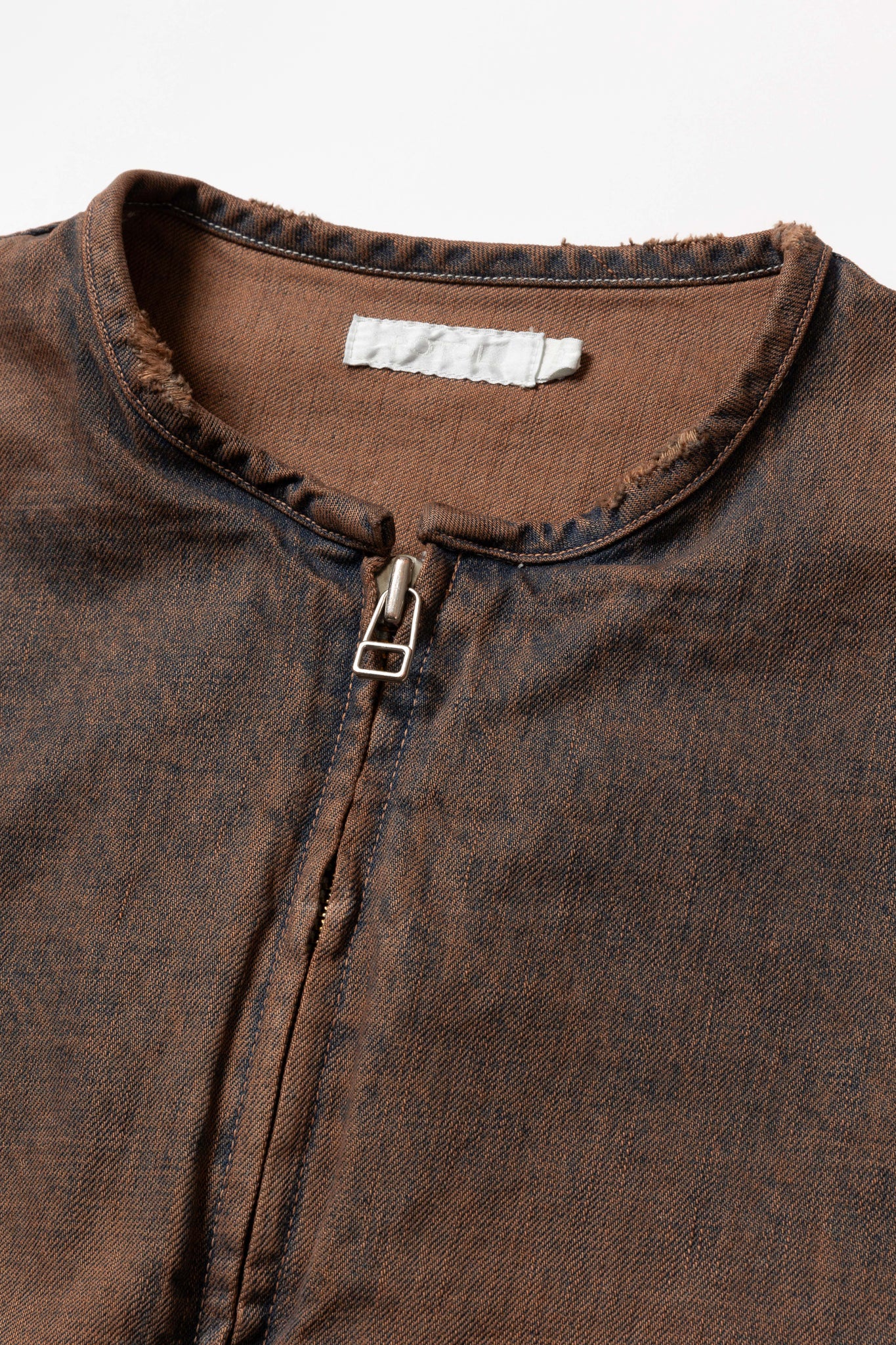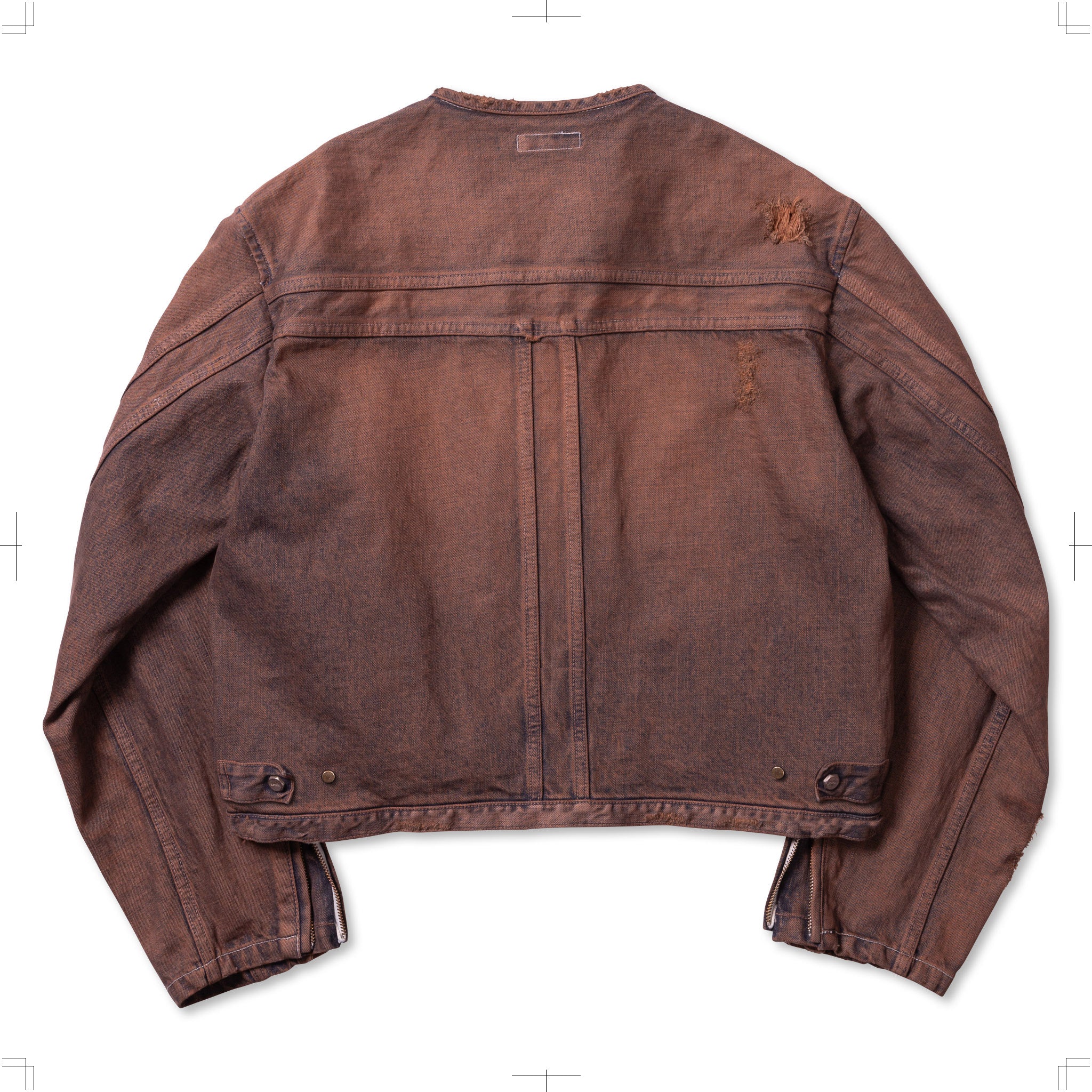 シングルライダースをベースにしたデニムジャケット。前面はミニマルなデザインに仕上げ、背面には2重のTバック切り替えを施して無骨な印象に落とし込んでいる。素材には厚みのある13ozデニムを採用。製品加工商品のため個体差が生じます。