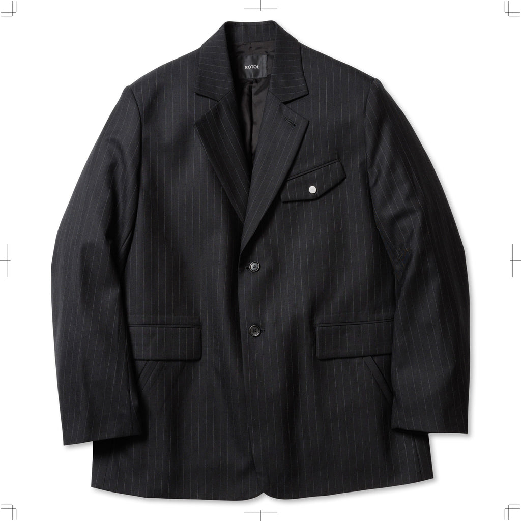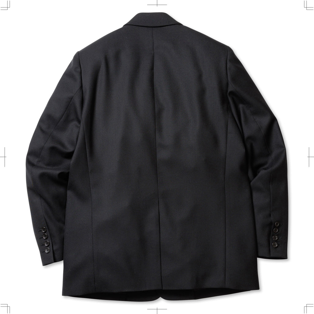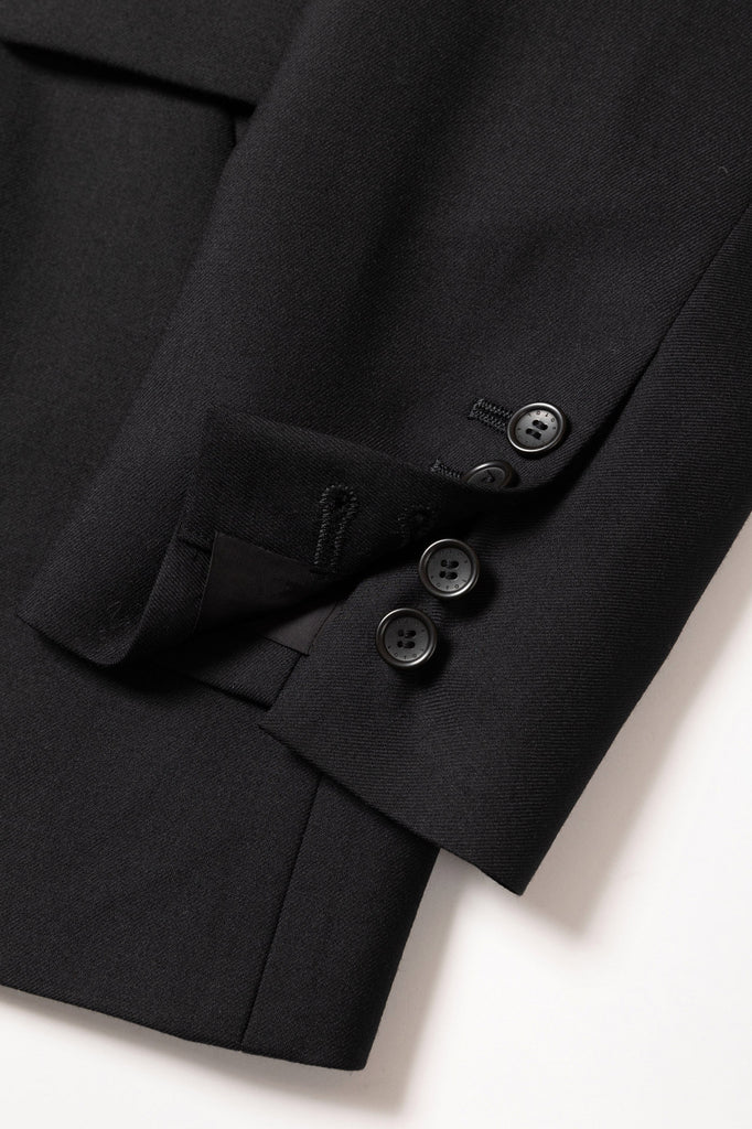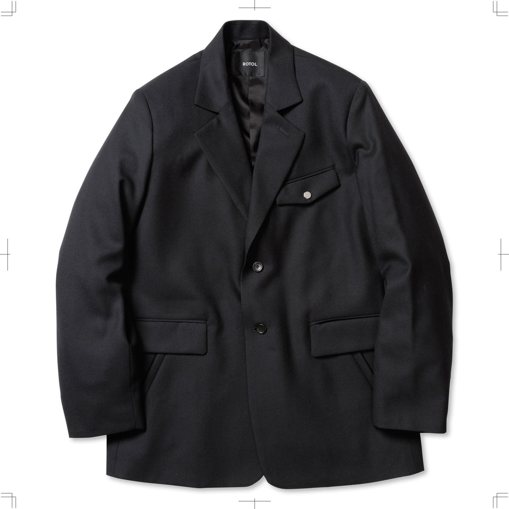 A relaxed-fit single-breasted tailored jacket made from SUPER100S wool serge. To allow for styling as a stand collar, a button is placed at the collar. The chest pocket is adorned with the iconic hexagonal dot button, and the cuffs feature functional buttonholes. The waist pockets combine flap pockets and slash pockets for added functionality and design.