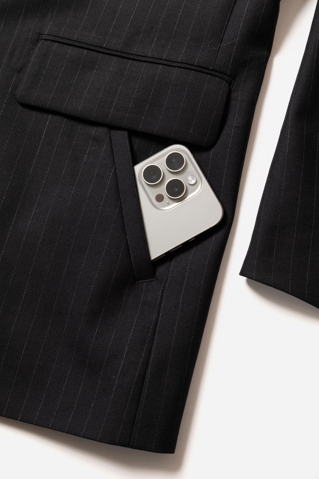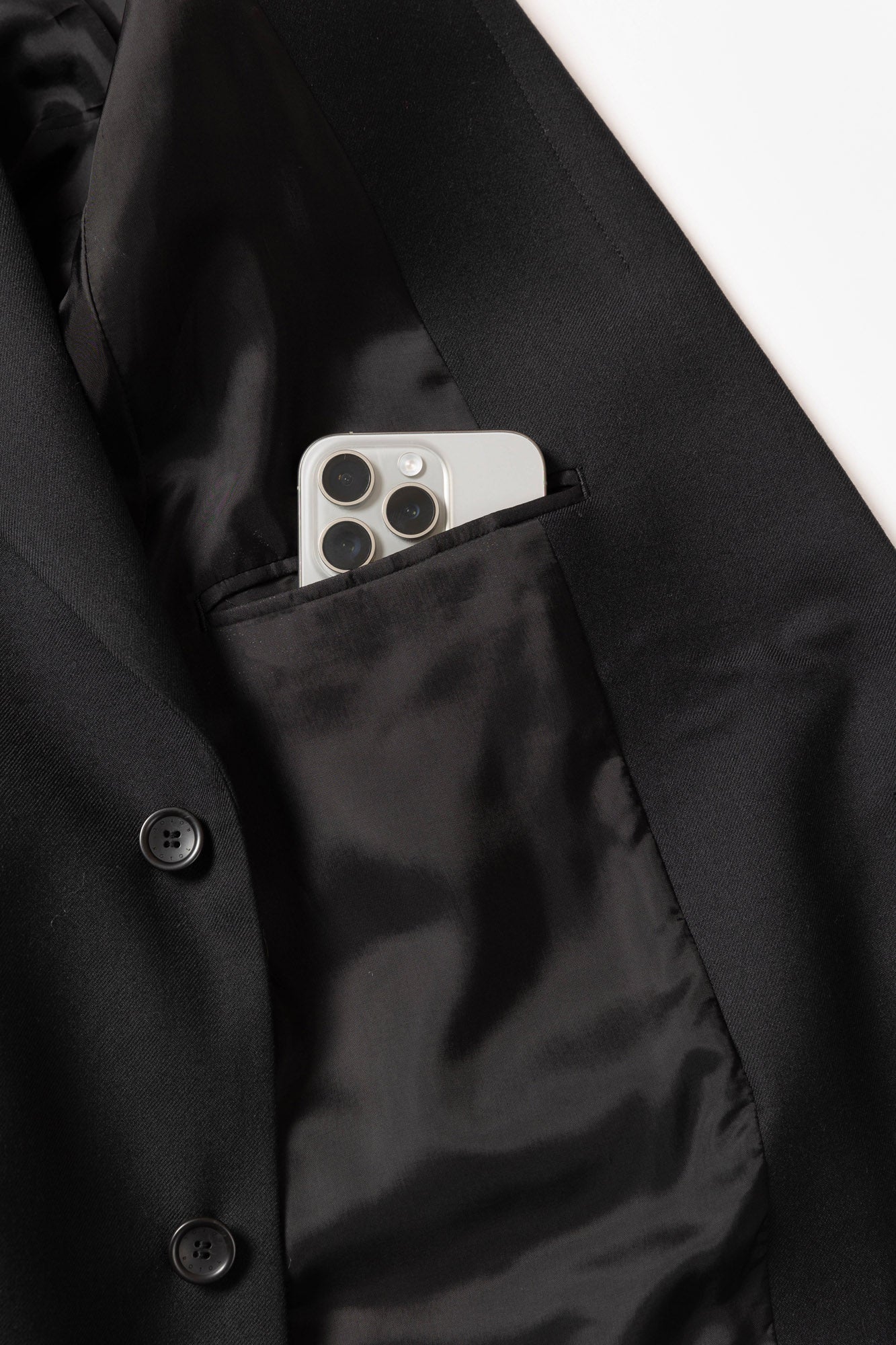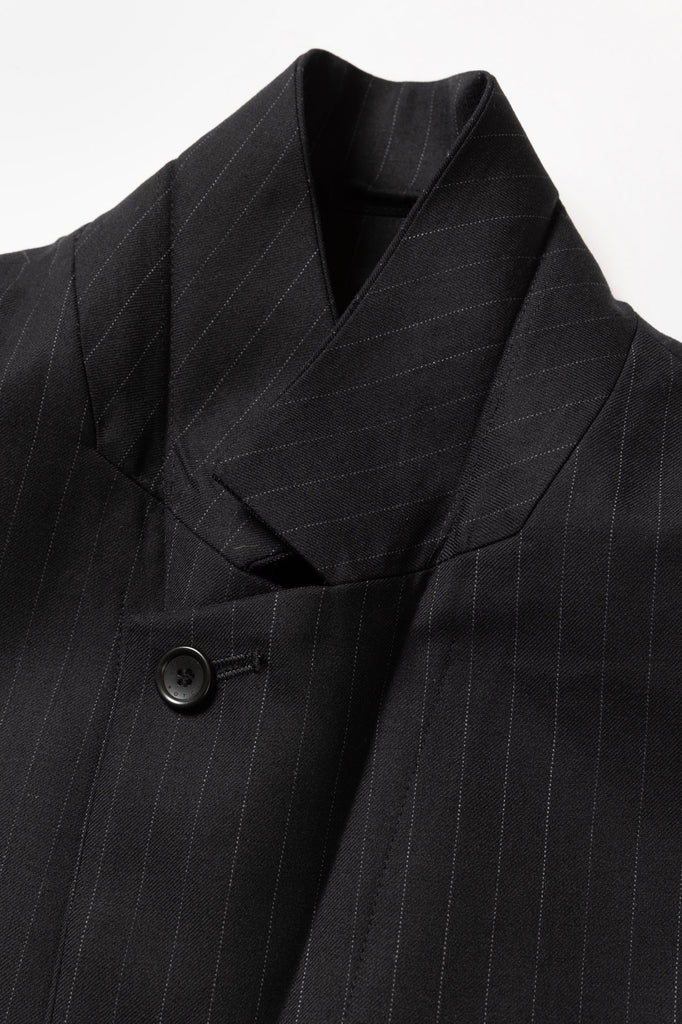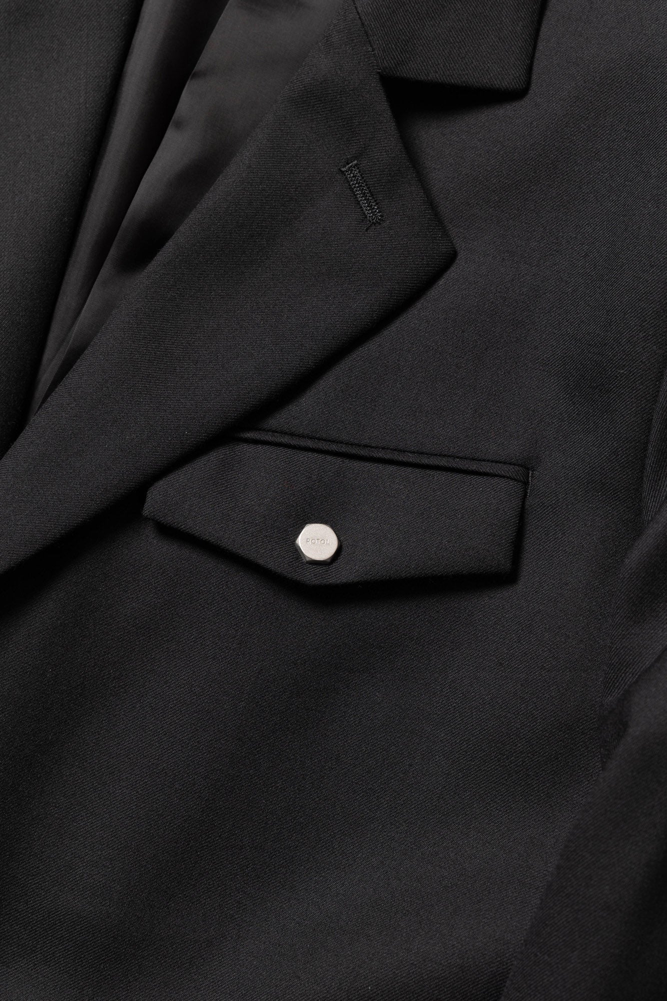 A relaxed-fit single-breasted tailored jacket made from SUPER100S wool serge. To allow for styling as a stand collar, a button is placed at the collar. The chest pocket is adorned with the iconic hexagonal dot button, and the cuffs feature functional buttonholes. The waist pockets combine flap pockets and slash pockets for added functionality and design.