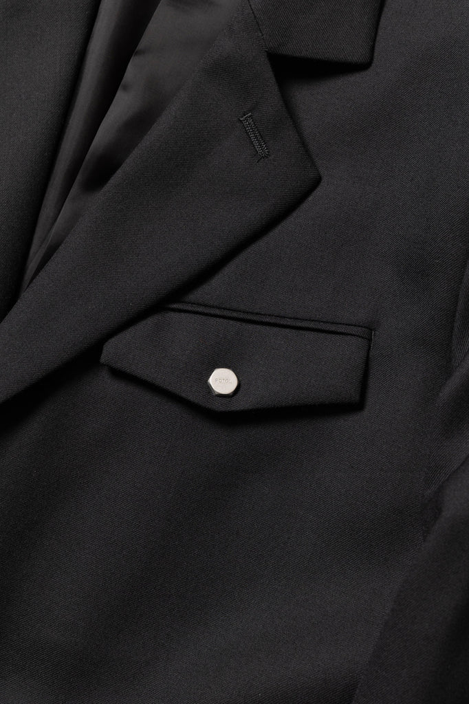 SUPER100Sのウールサージで仕立てたリラックスフィットのシングルテーラードジャケット。スタンドカラーとしても着用できるよう、襟元にボタンを配備。胸ポケットにはアイコンの六角ドットボタンをあしらい、袖口は本切羽仕様。腰ポケットにはフラップポケットとスラッシュポケットを組み合わせている。