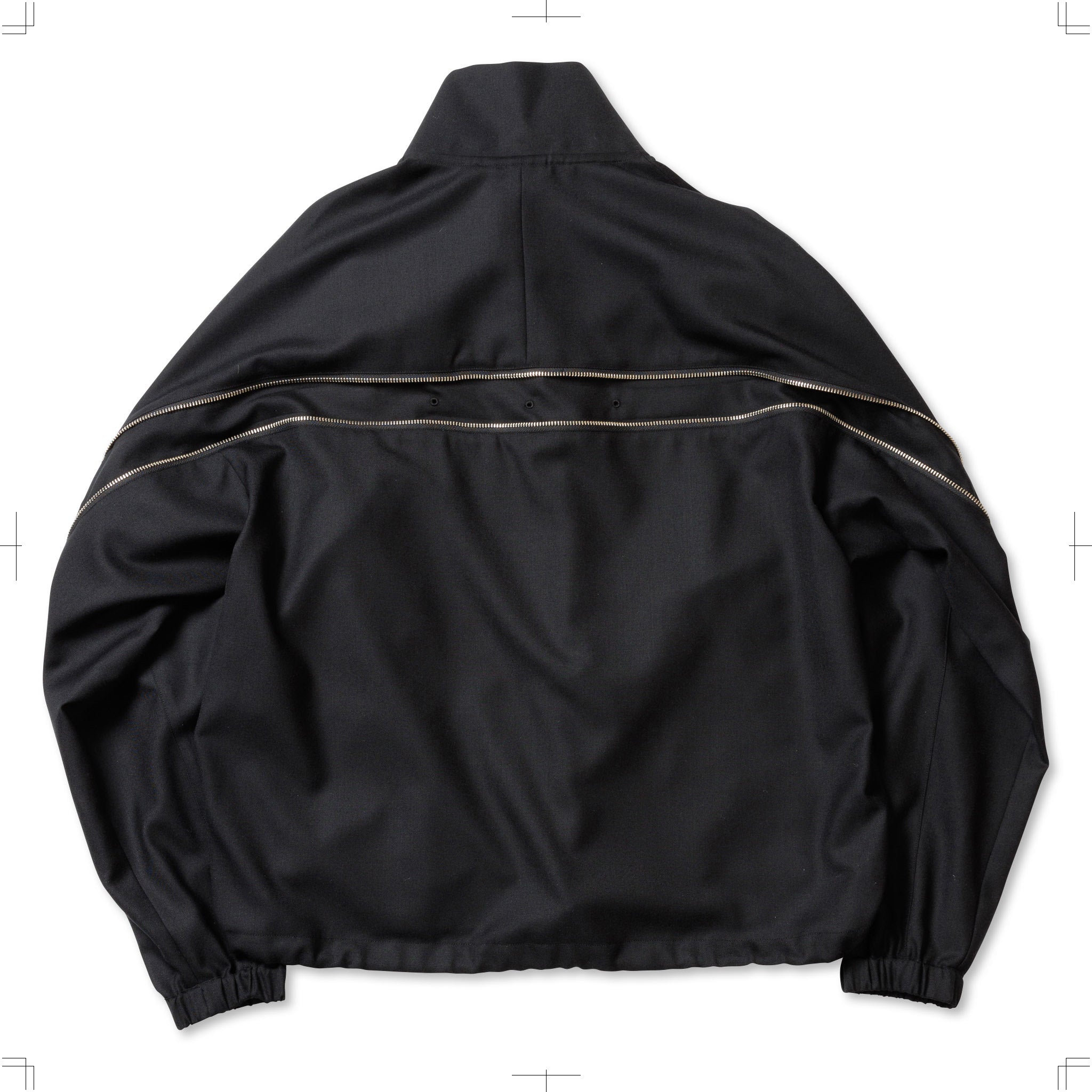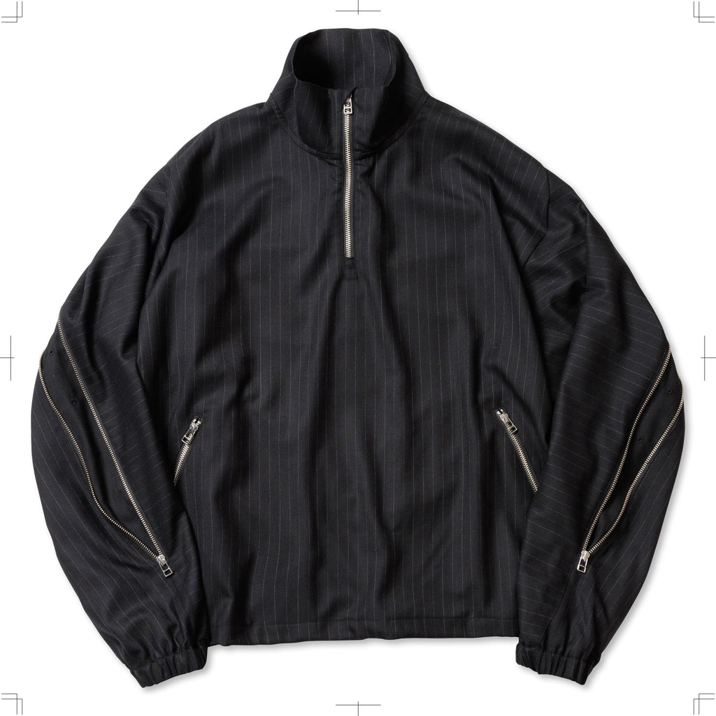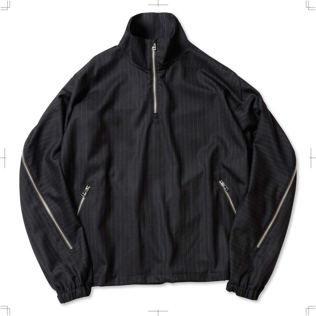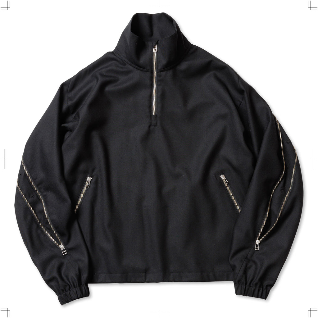 SUPER100Sのウールサージを使用したリラックスフィットのハーフジップブルゾン。背中にはシルエットを変化させるジップを配し、腰にはジップポケットを設置。裾にはドローコードを備えている。