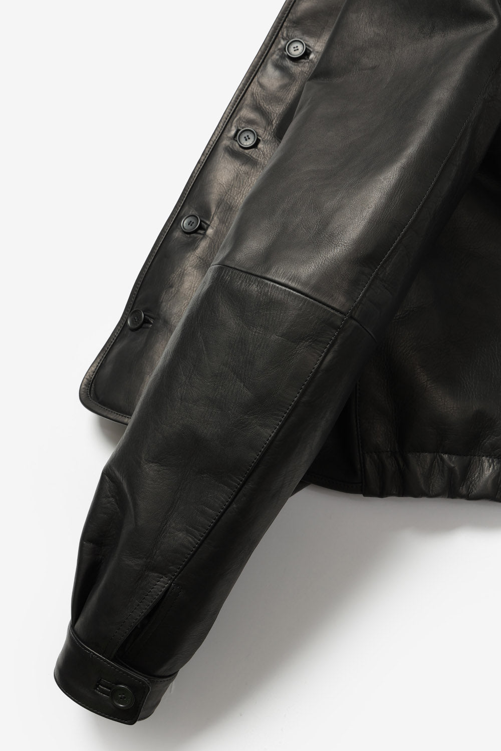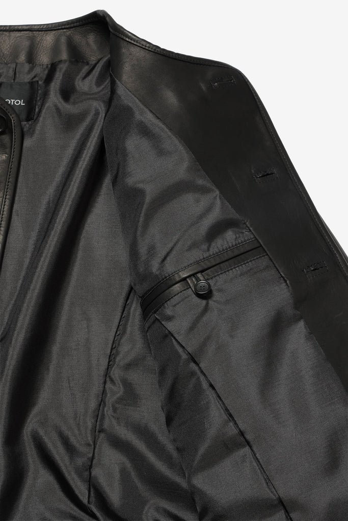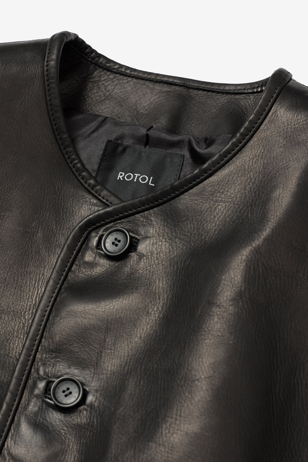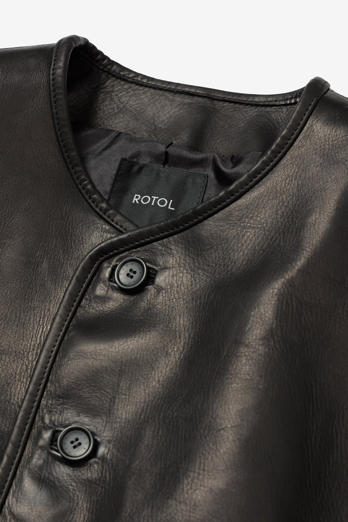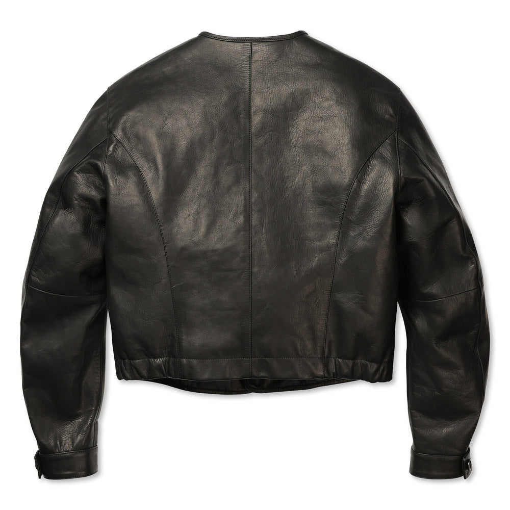 Collarless jacket made from thick cow leather soaked in oil. Featuring a minimalist design, curved seam details, gathers at the back hem, and wide armholes, it has a modern pattern that offers a sense of freedom without feeling constrictive. Practical zip pockets and buttoned cuffs add functionality to the jacket’s high-quality appearance.