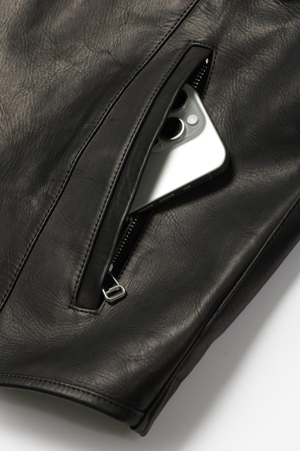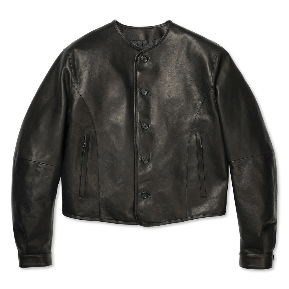 オイルを染み込ませた厚みのあるカウレザーを使用したノーカラージャケット。