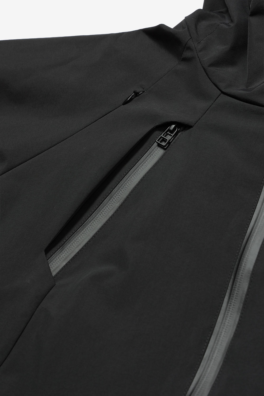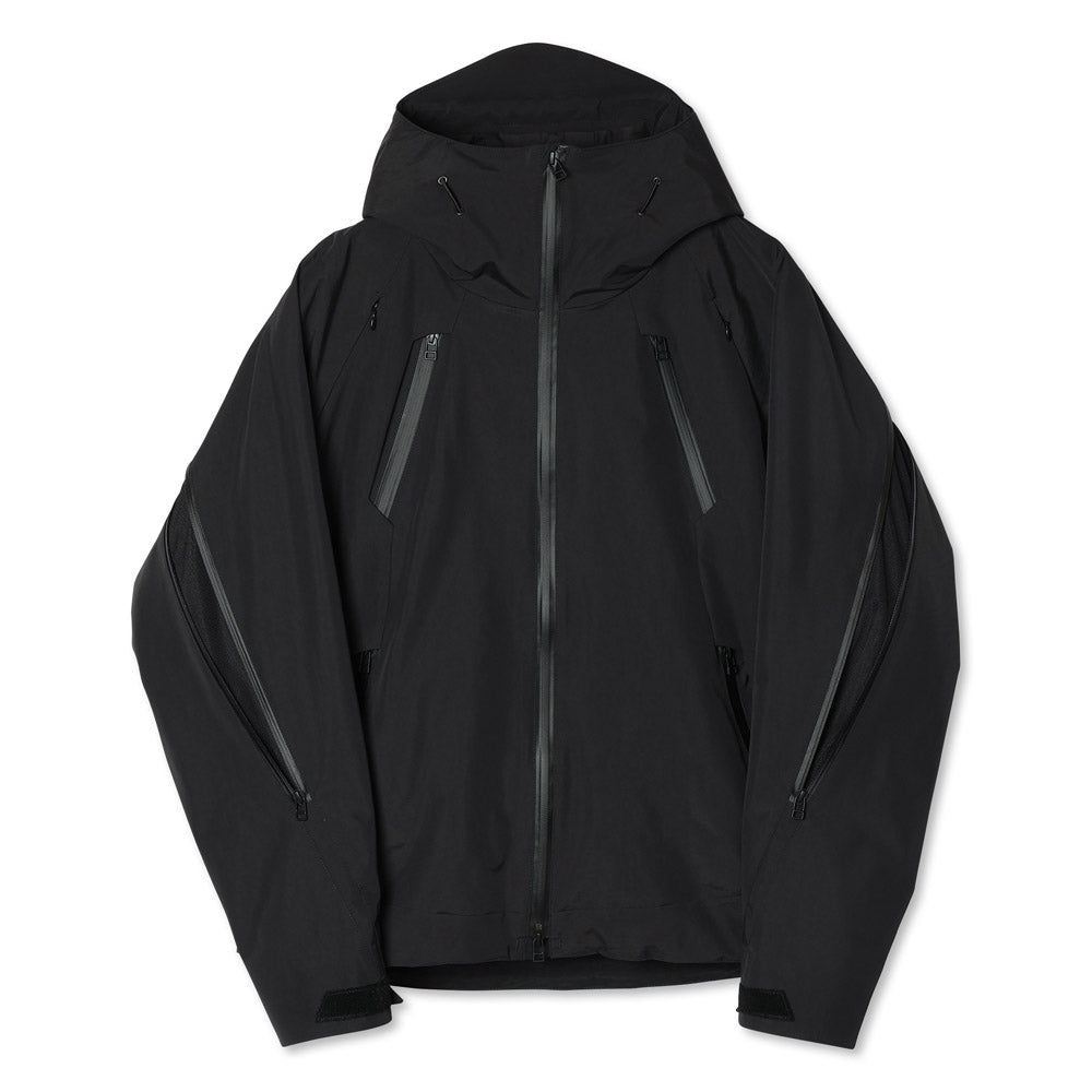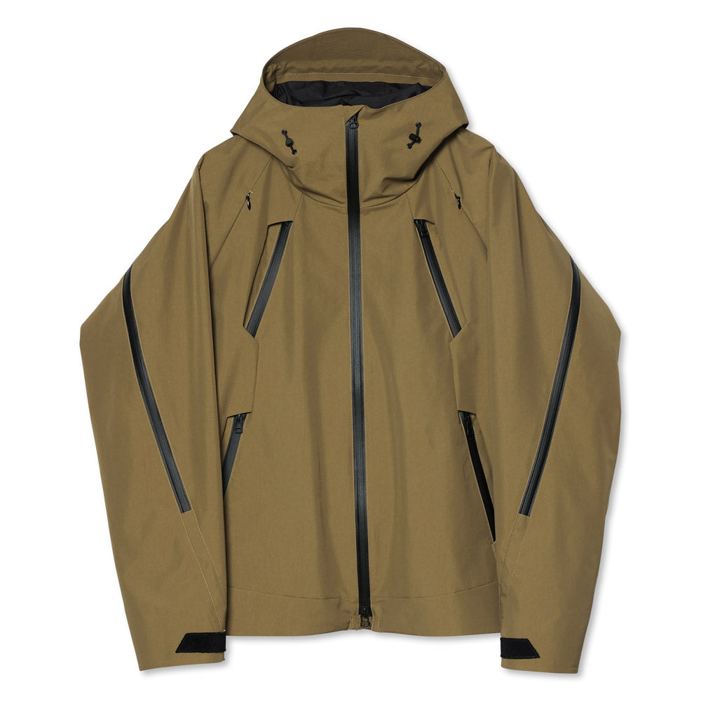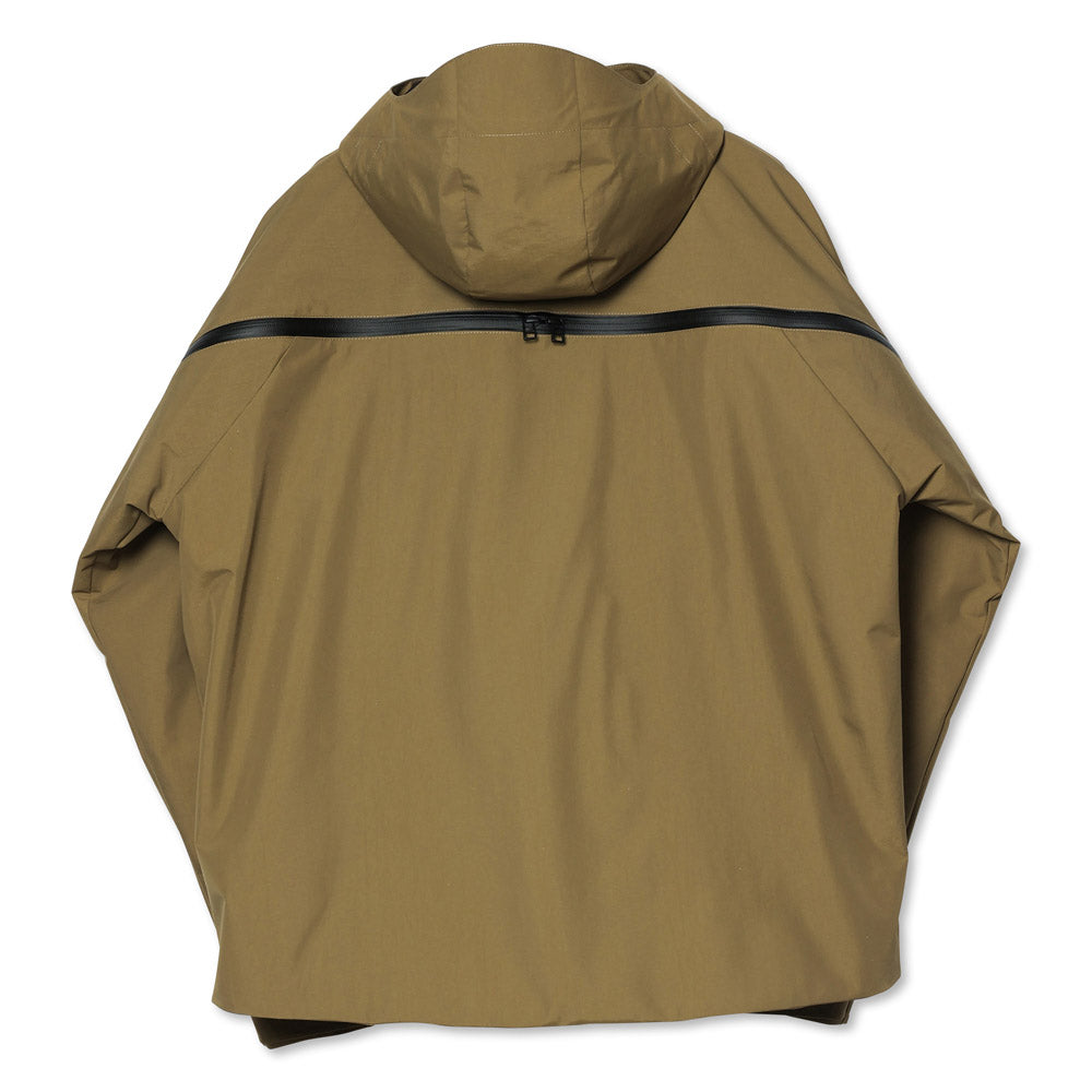 Shell parka made from nylon with breathable and waterproof functionality. The front and four pockets are equipped with water-resistant zippers, while the chest features ventilation zippers. The back also includes a zip that provides both ventilation and alters the silhouette. To enhance the fit, the hood is designed with two types of drawcords around the face.