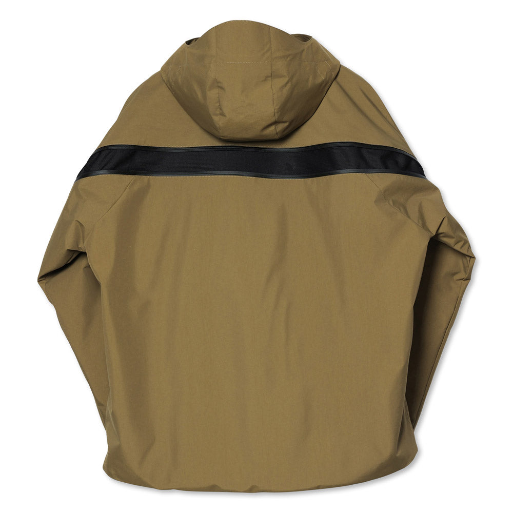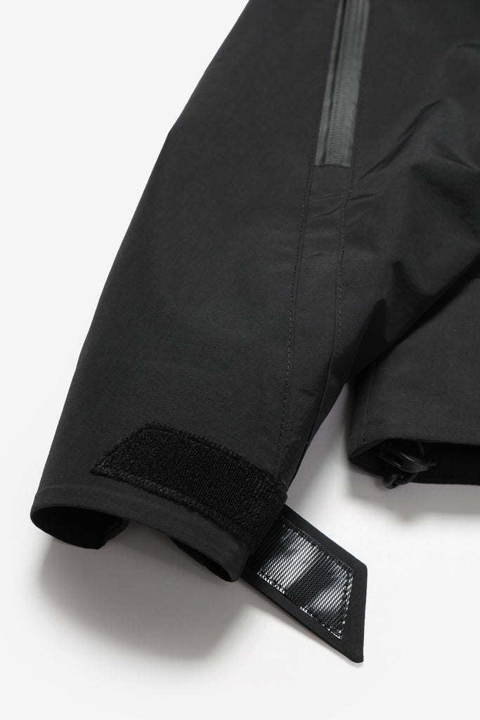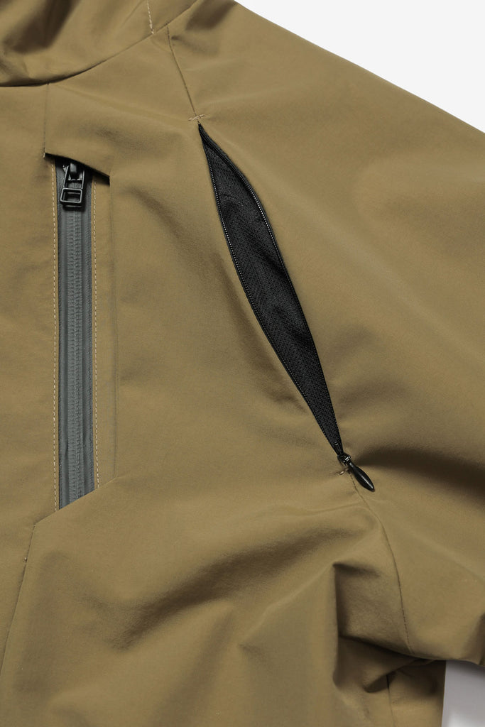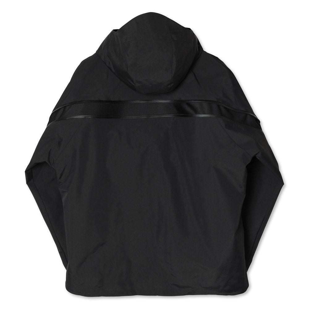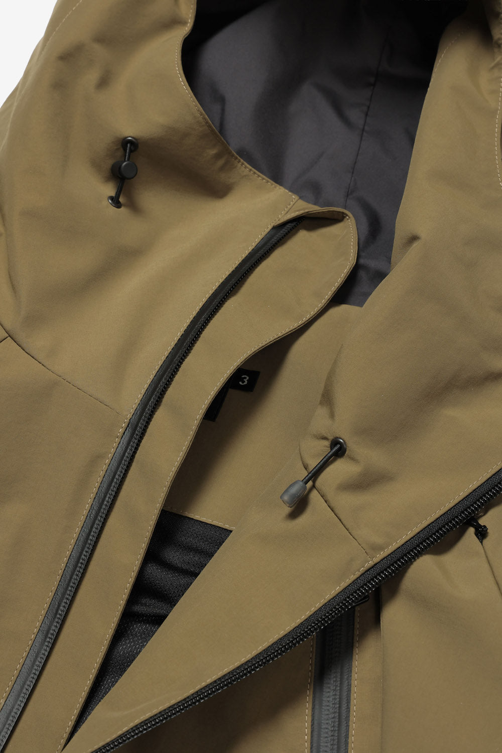 Shell parka made from nylon with breathable and waterproof functionality. The front and four pockets are equipped with water-resistant zippers, while the chest features ventilation zippers. The back also includes a zip that provides both ventilation and alters the silhouette. To enhance the fit, the hood is designed with two types of drawcords around the face.