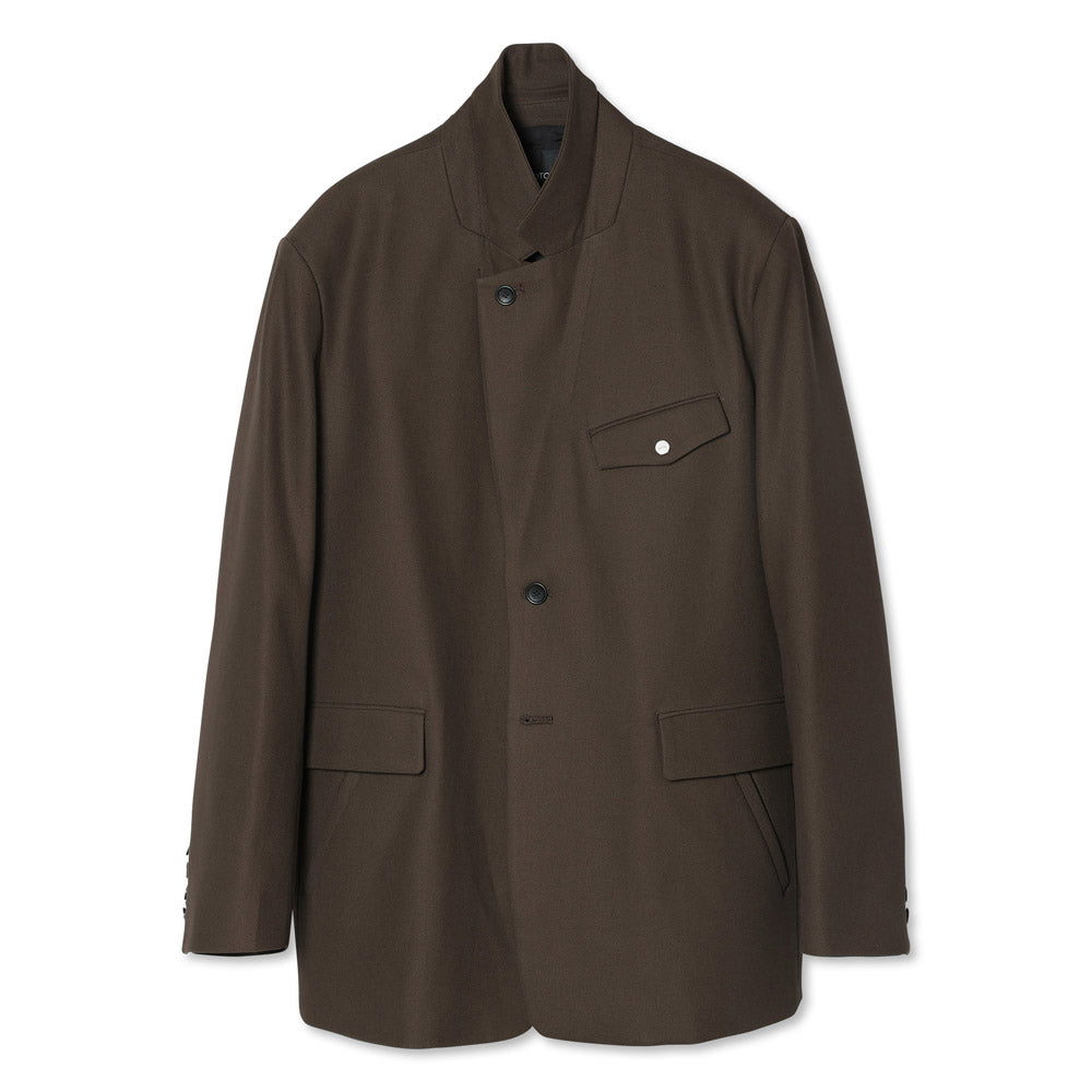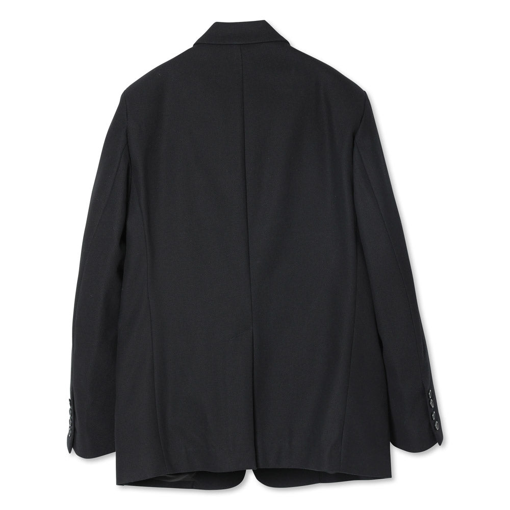 Relaxed-fit single-breasted tailored jacket made from cotton serge fabric. The collar features a button, allowing it to be worn as a stand collar. The chest pocket is adorned with the brand’s iconic hexagonal dot button, and the cuffs are designed with functional buttonholes. The waist pockets combine a flap pocket and a slash pocket for added practicality.